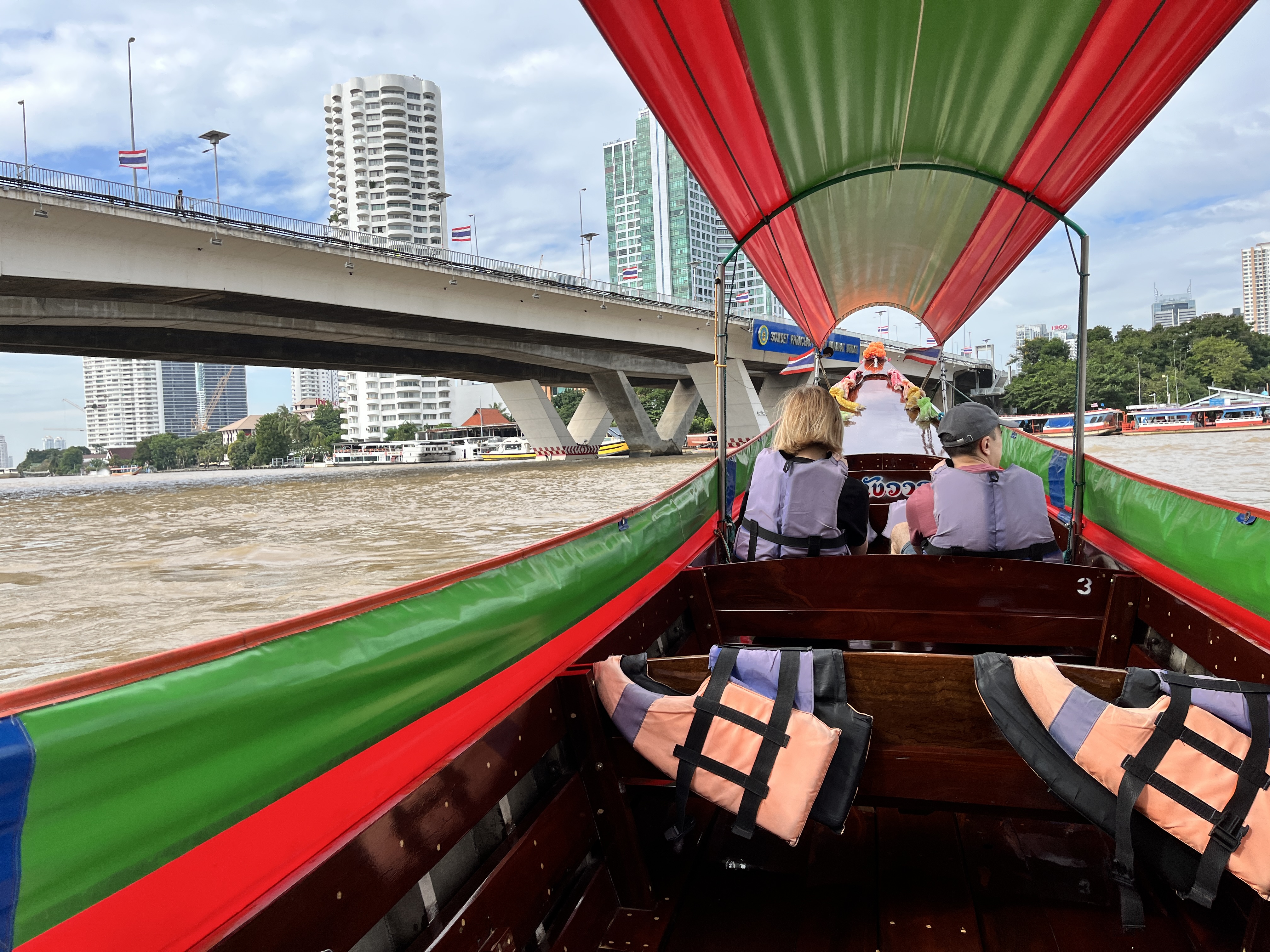 C’est une bonne occasion de découvrir un autre visage de Bangkok, plus paisible. Après une heure de navigation bercée par le moteur de camion ronronnant à ciel ouvert , tenu à bout de bras par un pilote costaud, retour sur le fleuve. Les long tails des touristes défient ici les convois de barges tirées par des remorqueurs, un balai bien orchestré. J’ai choisi de rentrer à mon hôtel en utilisant le bateau-bus qui dessert tout le quartier de la vieille ville pour éviter la circulation du centre-ville pendant la période de pointe. Je termine cette première balade dans la capitale en allant dîner (à pied !) au Night Bazaar, situé au sud-est de la ville. Camelots, street food, boutiques à souvenirs, empire du toc, débauche de néons, un vrai bonheur.