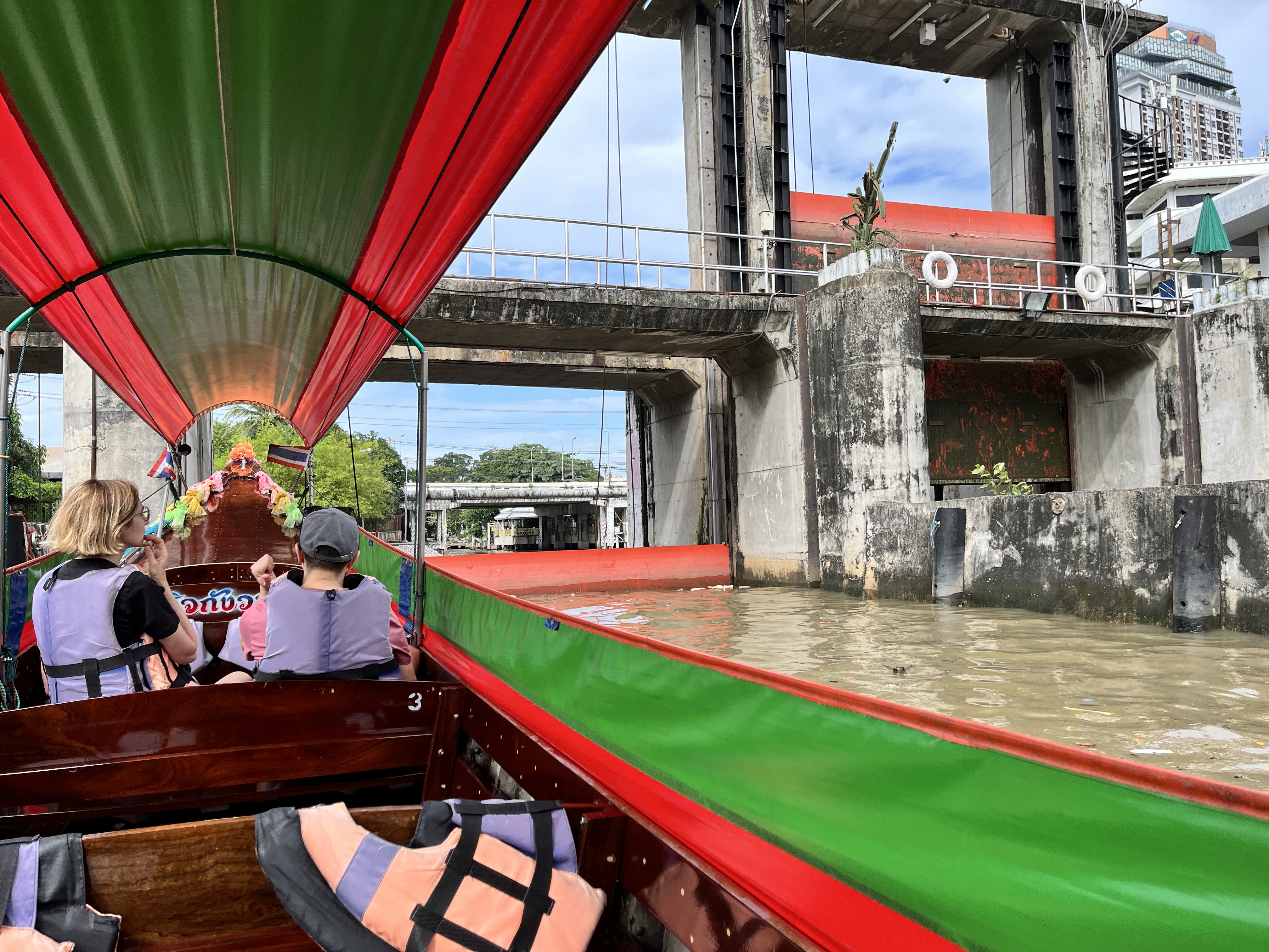Bangkok est immense, épuisante, j’ai parcouru tout de même une douzaine de kilomètres chaque jour ! Je renonce toutefois à me rendre à pied à l’embarcadère très éloigné desservant les khlong, ces canaux qui sillonnent la Cité des Anges  sur la rive droite du fleuve. La moto Grabe me dépose sur le site calé sous un pont, je négocie un tarif solo et embarque sur un long tail avec un jeune couple de Hollandais suréquipés en matos photo. La balade débute par une courte traversée jusqu’à l’écluse d’entrée du canal, plus bas que le fleuve.
