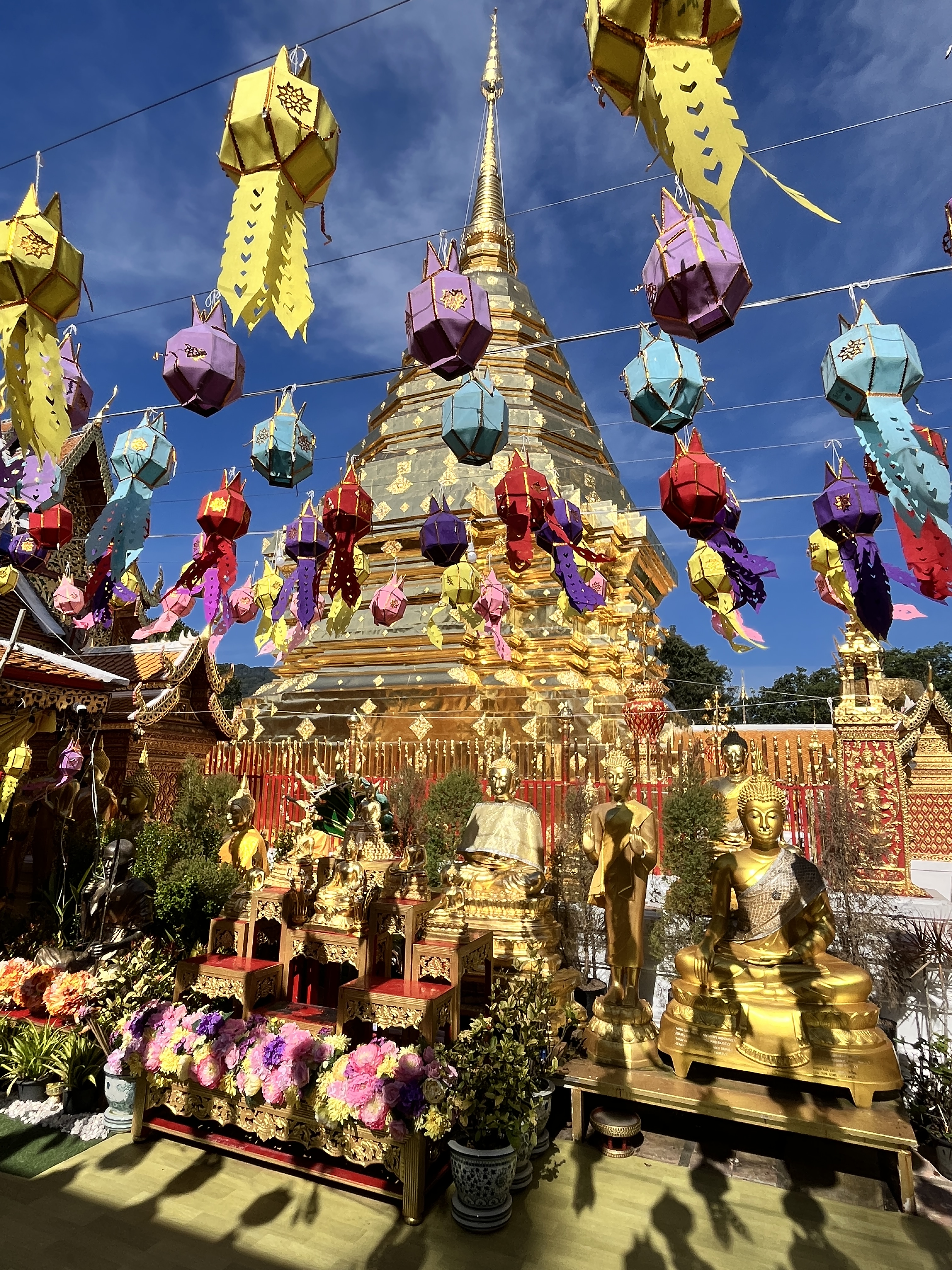 La cité grouille d’expositions d’art contemporain, de galeries et bien sûr de restos, d’agences de voyages et bien sûr de salons de massage. C’est ici que vous partirez en trek dans le fameux Triangle d’or, ses montagnes, ses minorités ethniques, peut même à la rencontre des éléphants et du Mékong. Pour ma part, un autre programme. La montée au mont Suthep et la visite du temple au sommet restent un must. Je décide de m’y rendre tôt et me rends à la station des taxis collectifs (rouges) à côté du marché. Les chauffeurs y prennent leur petit déj en attendant qu’au moins six clients se présentent. Rien ne presse vraiment, mais après d’une demi-heure, nous sommes seulement trois : une Argentine, une Japonaise et moi. Lassés d’attendre , nous prendrons finalement un Grabe en commun. Les cyclistes sportifs se frottent à une interminable montée pour atteindre 1676 m d’altitude et admirer , avec un peu de chance, le lever de soleil sur la ville.