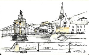 Les chemins de Compostelle sont toujours l’occasion de rencontres passionnantes . C’est à Saint-Julia que j’ai fait la connaissance de Gerald et de sa femme, comme çà simplement , autour de la table du petit déjeuner dans un gîte confortable planté sur une colline du Gers. Le couple venait d’Autriche, comme Hans Peter , mon compagnon suisse de route et de hasard nous étions tous les quatre parti d’Arles sur le GR653 en direction de Punte La Reina en Espagne. Après quelques échanges, alternant l’anglais et l’allemand histoire de faire connaissance, Gerald ouvrit naturellement un carnet de moleskine sous mes yeux . Je lui demandais alors de le parcourir, et c’est avec surprise que je découvris que derrière ce pèlerin jusque là anodin et discret se cachait un artiste . Depuis 2015, cet ancien architecte de 70 ans, vivant aujourd’hui dans une vallée viticole proche de Vienne, dessine désormais pour son seul plaisir sur les chemins jacquaires de France et d’Espagne, en consacrant à cette passion de 30 à 45 minutes par jour environ. Alors que la plupart des randonneurs au long court se concentre sur la longueur des étapes ou shootent avec frénésie des centaines de photos numériques, Gerald savoure le temps d’une pause et prend le temps de fixer sur ses carnets la beauté des édifices ou des décors qui rythment son parcours. Equipé de Rotring et de quelques peintures à l’eau, l’ex-architecte devenu marcheur perpétue l’art du carnet de voyage en mettant à profit un sens aigu de l’observation propre à son ancien métier. Une fois le dessin terminé, il le complète d’une fine légende dont l’encre de Chine relève encore la finesse de l’ensemble. J’ai feuilleté ce carnet jusqu’à la dernière page et je l’ai refermé encore sous le charme de ce chemin d’Arles coloré. Mais au-delà des croquis j’ ai aussi découvert ce matin-là une autre philosophie du voyage, celle d’un pèlerin libéré du temps. Plusieurs de ses dessins m’ont aussi révélé des lieux où j’étais passés sans rien voir de leur intérêt, en randonneur trop pressé .