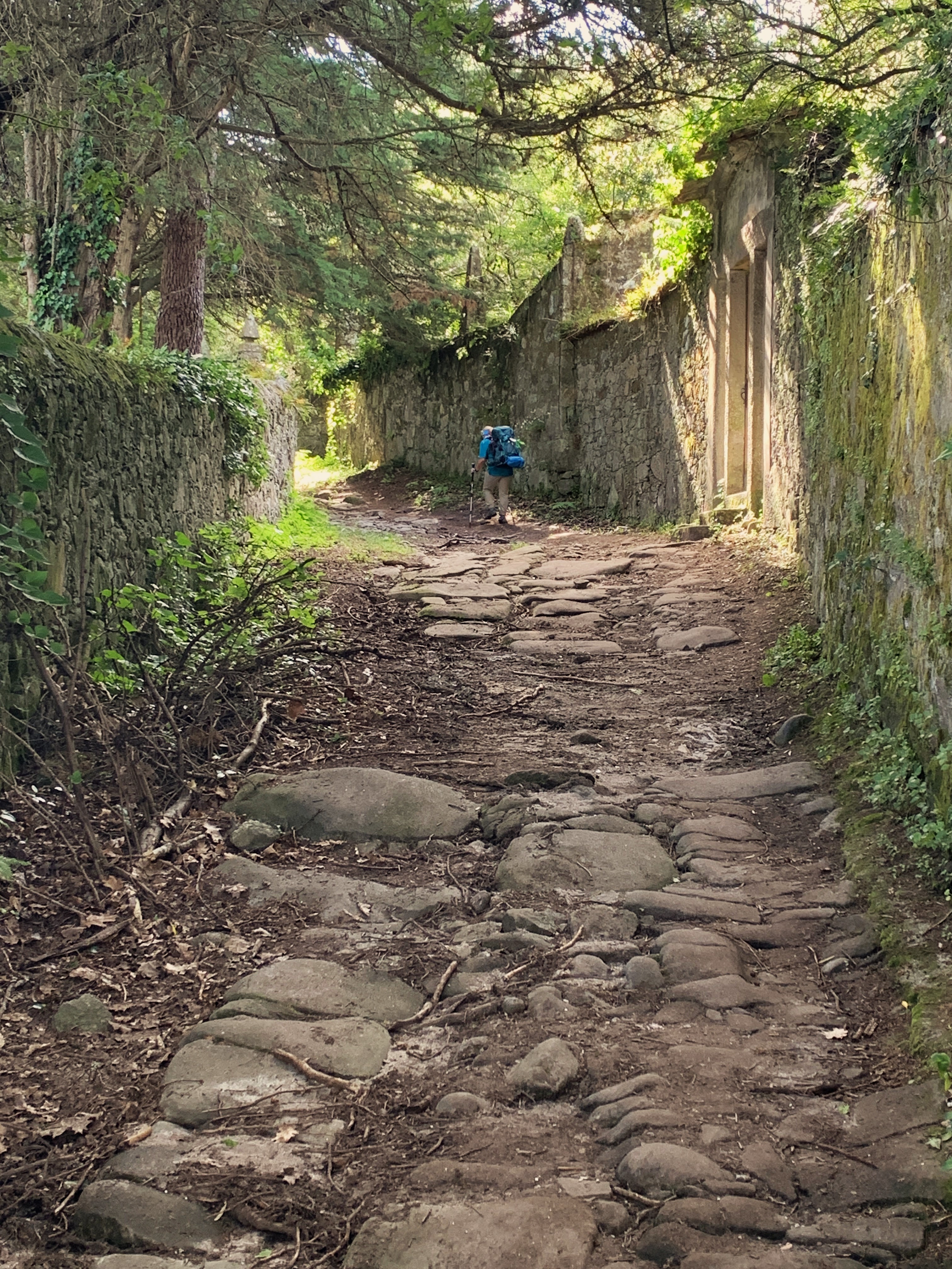 Plus loin, l’arrivée en Cantabrie est marquée par la multiplication des secteurs d’asphalte, alors que le relief s’assagit. Ces 150 à 200 km s’avèrent ou s’avéreront traumatisant pour les jambes, notamment genoux et tibias déjà soumis à une semaine d’effort. Et pourtant il n’a pas fait chaud cette année, ce qui a minimisé ces traumatismes dus aux chocs répétés sur un sol dur. Cependant, j’ai ainsi assister à de multiples abandons à la sortie de la Cantabrie suite à des périostites, des tendinites diverses ou tout simplement à une véritable lassitude de marcher sur route. La mauvaise météo a encore joué un rôle important et l’expérience a probablement fait la différence .