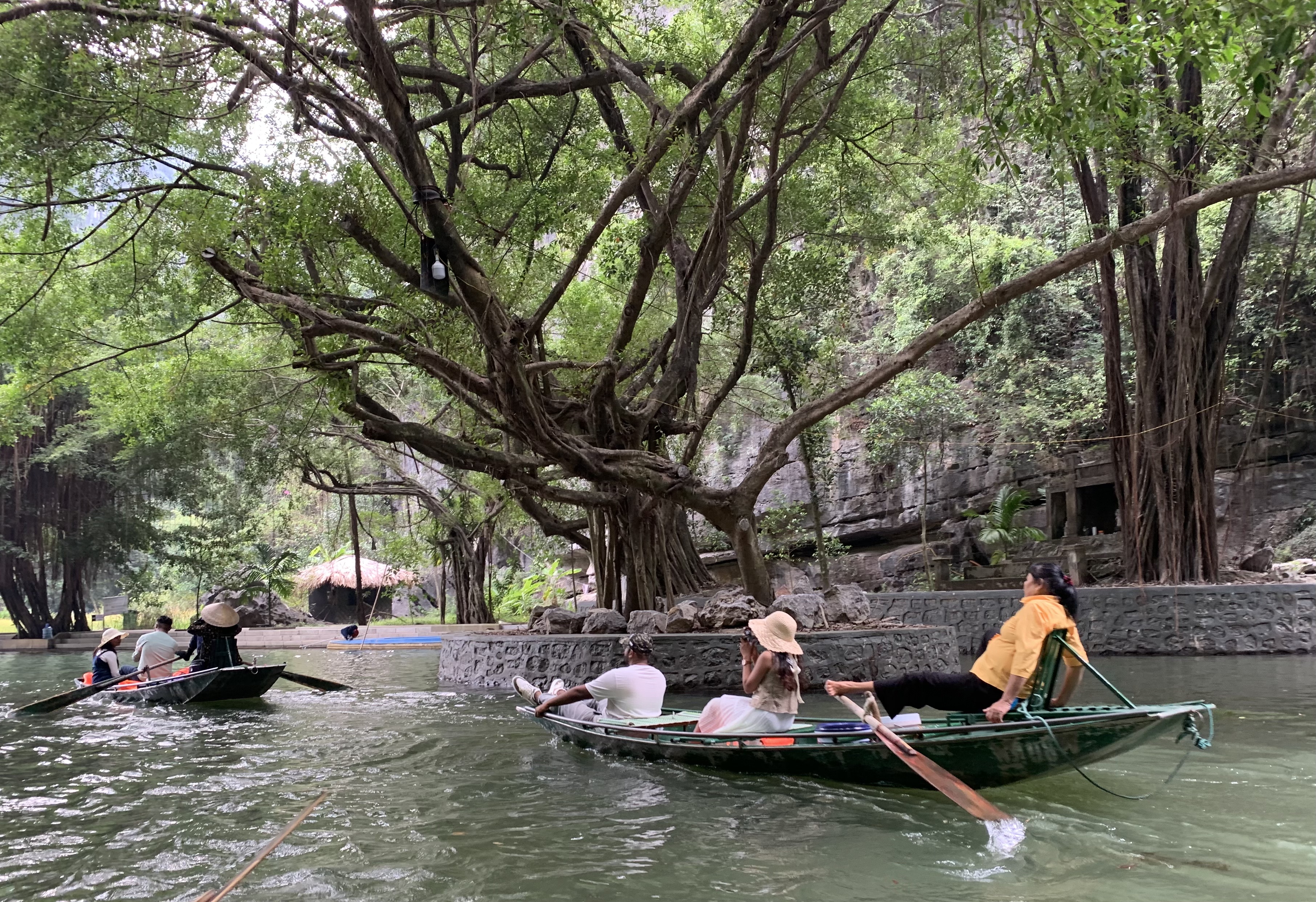 Madame Thuin passe me prendre au Center Point Hotel, un bon établissement blotti dans une rue calme. Elle sera ma guide francophone pour cette escapade. La petite femme au regard pétillant est pourtant inquiète ce matin en quittant Hanoï. Notre voiture se fait arrêtée par un policier à une intersection sans raison apparente . Le flic demande au chauffeur de descendre, de le suivre. Ils partent près d’une demi heure quelque part. L’affaire s’est probablement soldée par un bon bakchich. Car la corruption mine hélas le pays me fait comprendre à mi- mots Thuin. Je constaterai tout au long de ce voyage que la population reste encore extrêmement prudente, sans tomber dans l’atmosphère paranoïaque de la Birmanie (Myanmar). Ma guide me conduit à Ninh Binh, l’ancienne capitale du Vietnam , puis à la rivière de Tam Coc qui fait partie des sites touristiques parmi les plus fréquentés.