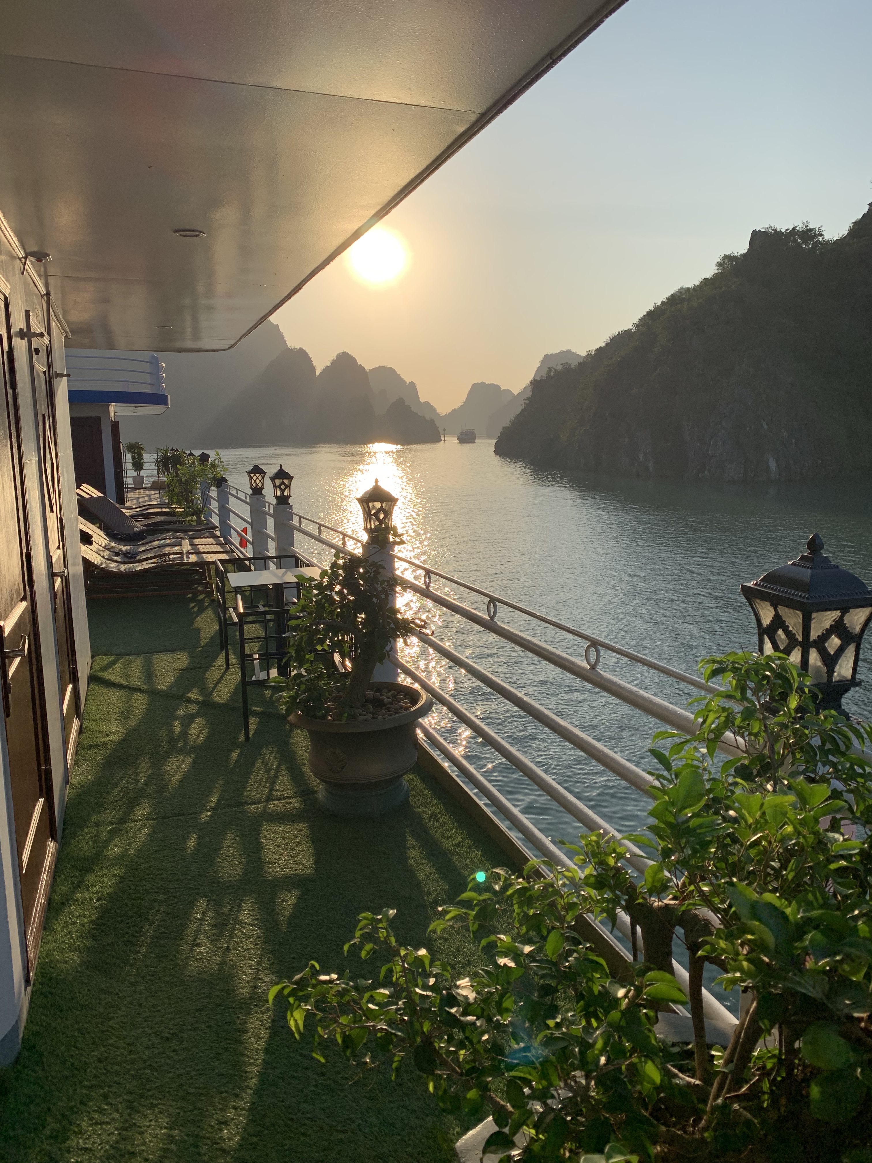 L’exploration du nord Vietnam proposée avec mon agence ne pouvait éviter cette fameuse Baie Ha Long (« Le dragon qui plonge dans la mer »), l’un des joyaux de ce pays. Le nec plus ultra consiste à passer une nuit sur une « jonque ». Des dizaines de mini bus déversent les futurs passagers. Le port d’embarquement est une véritable ruche ou se croisent les groupes menés par un animateur armé d’un stick télescopique orné d’un fanion . Pas question de se tromper de bateau ! Je suis bien au cœur de l’hyper tourisme. Le mien s’appelle Swan, une navette m’y conduit et je m’installe au pont supérieur dans une des dix huit cabines. Mes rêves d’aventure tombent à l’eau, cette mini croisière s’enfonce seulement de quelques miles dans cet univers « amazing » parsemé de 1842 îlots . Le temps est doux, la mer calme et le Swan glisse lentement dans les chenaux balisés. Comme sur tous les navires, l’après-midi est consacré à une sortie en kayak. Cette escapade commence obligatoirement par un passage au bureau de la baie pour obtenir une autorisation en règle auprès de l’agent du gouvernement qui vit plusieurs mois dans ce bureau flottant. Baignades, kayak, pêche, le fonctionnaire surveille tout. La balade dure une bonne heure et se ponctue pas une baignade. Cours de Tai Chi et cuisine sur le pont supérieur complètent ce programme type. D’autres croisières similaires partent aussi de Cat Ba.