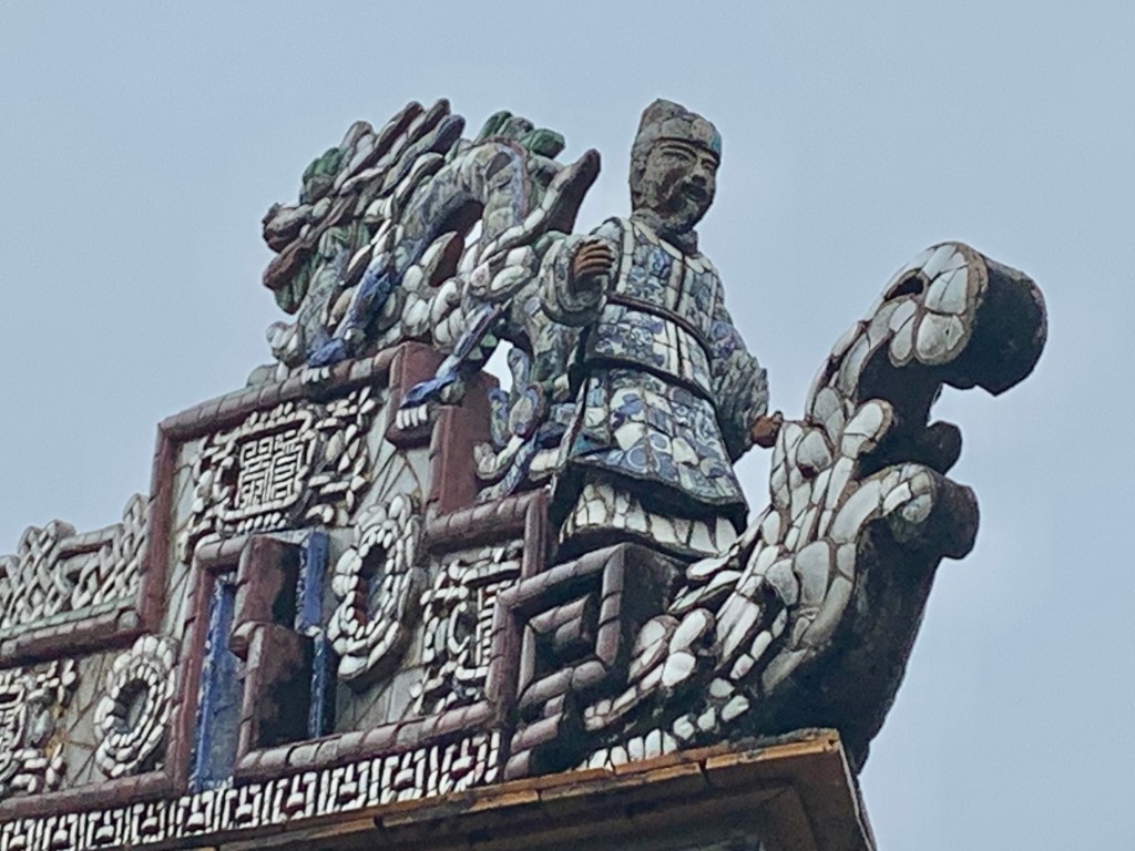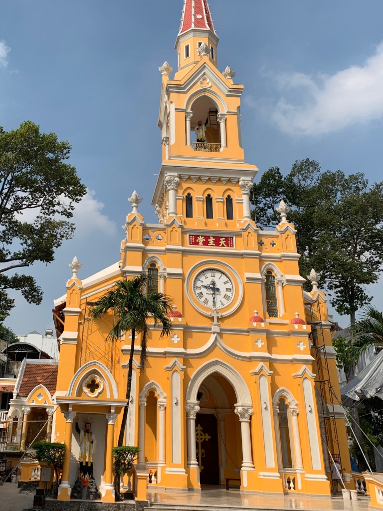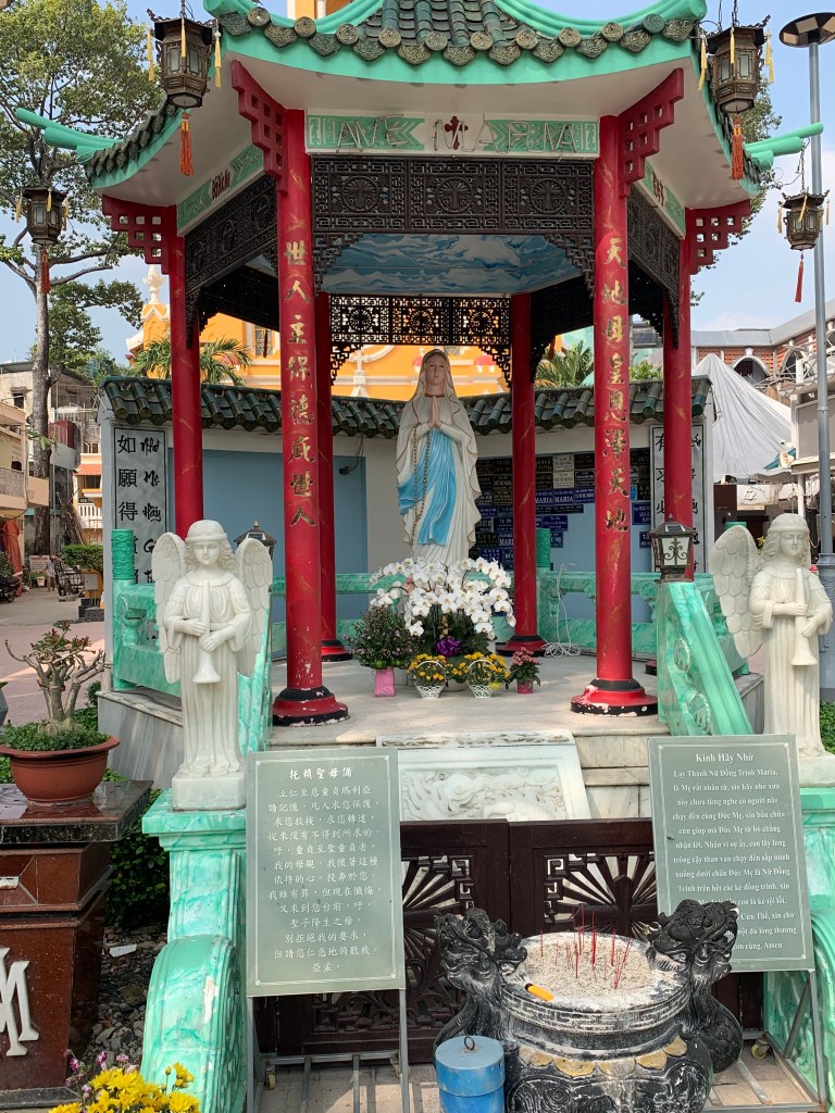 Cette errance me permet de visiter le très beau temple Tam Son Hoi. La chaleur est accablante, l’odeur d’encens, la fraîcheur et le calme du site sont reposant avant de reprendre ma balade. Je tombe encore par hasard sur un site surprenant : l’Eglise Cha Tam. Le Vietnam compte environ 25 millions de catholiques et il existe de très nombreux églises dans tout le pays. Celle-ci est ravissante avec ses façades colorées, son kiosque fleuri abritant une vierge Marie, un mur de bas reliefs en bronze qui évoque les martyrs chrétiens et des inscriptions en chinois parfaitement anachroniques ici.