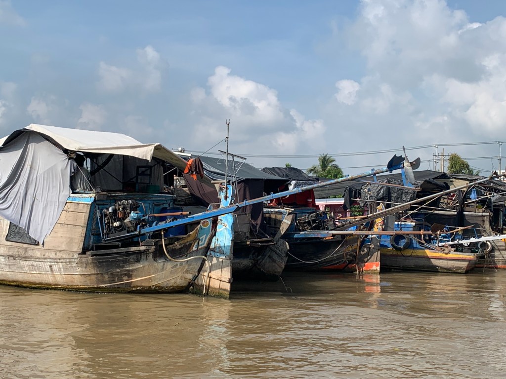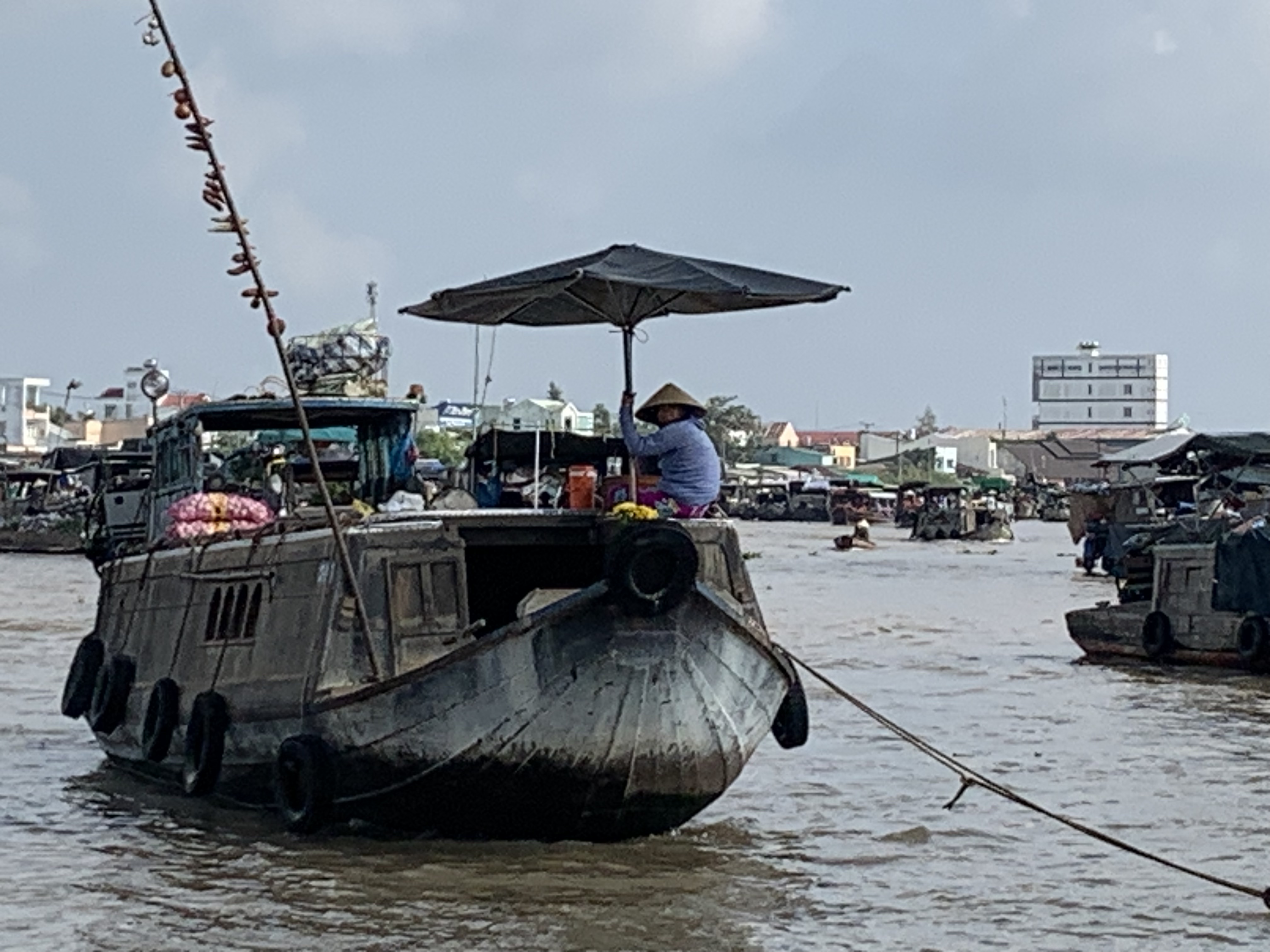 Mon guide du jour s’appelle .. disons Tanh, un pseudo dont je vous reparlerai plus loin. Can Tho est situé à 164 km de Saïgon Après une balade en barque sur un bras ombragé du Mékong, Tanh nous conduit jusqu’à l’embarcadère où sont amarrés les petits bateaux d’une trentaine de places. L’endroit n’est pas très reluisant. Distribution des gilets de sauvetage, direction le marché flottant. En toute franchise, cette étape hyper touristique ne présente aucun intérêt. Il s’agit d’un marché de gros, les marchandises sont stockées en cale pour les préserver. On est très loin du spectacle coloré de ceux de Thaïlande. Il existe presque d’avantage de bateaux de touristes que de marchands.