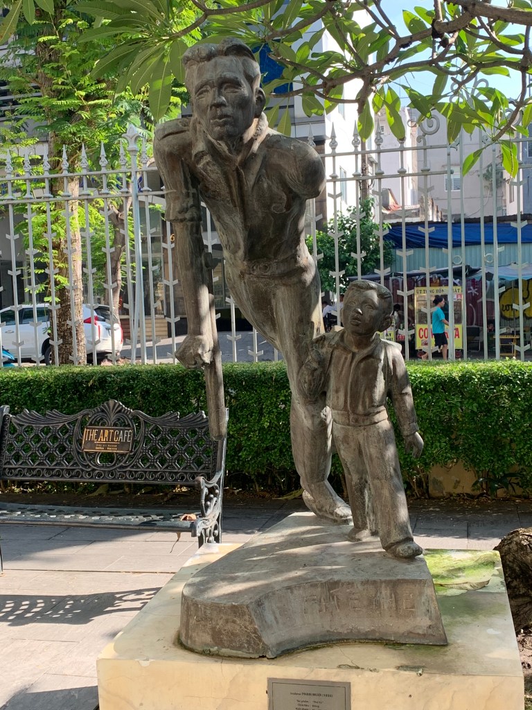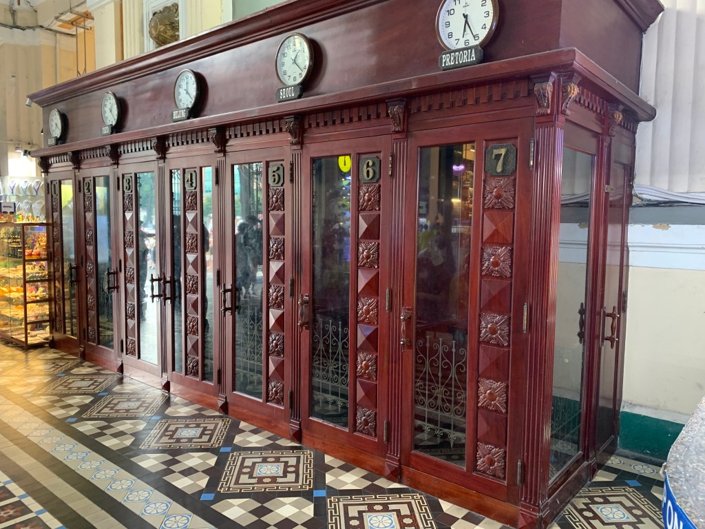 Décidément que cette ville est immense, bruyante et trop suffocante pour la parcourir toute une journée à pied. Le soleil est au zénith, je reprends une moto- taxi Grab pour rejoindre le District 1 (Saïgon en compte 24) et visiter une autre perle post-coloniale : la Poste Centrale. Le lieu n’en a plus que le nom, même si quelques guichets restent ouverts aux opérations postales. Ce magnifique bâtiment est lui aussi devenu une attraction touristique chargée. Les couloirs latéraux et les salles attenantes sont désormais entièrement voués à la vente de souvenirs et à la joallerie. Les splendides cabines téléphoniques de bois précieux et l’immense plafond vouté au style très « Musée d’Orsay » sont des témoins magnifiques de cette époque raffinée.
