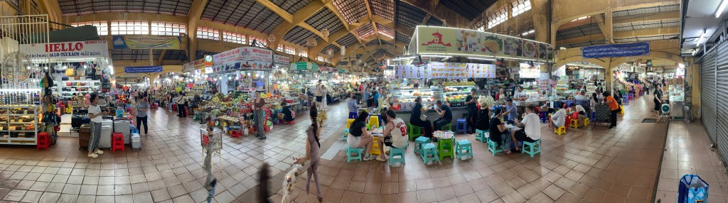 Je retourne à Saïgon plutôt déçu mais ravi de prendre un peu de repos Chez Mimosa Petite. La prestation de mon agence Far East Tour s’arrête là et je vais improviser un programme perso de trois jours. Je consacre le premier à une visite du marché de Binh Tay dans le quartier chinois de Cholon , situé à 6 km au sud-est du centre ville. Le trajet ne mérite pas de m’y rendre à pied et je fais appel au service de Grab. (L’App marche très bien et évite des marchandages de prix aventureux). J’y rencontre cette fois peu de touristes, le lieu est fréquenté par les locaux venant faire le plein de produits alimentaires . Le bâtiment ne manque pas de charme. Un hôtel bouddhiste siège dans le patio central et de beaux escaliers desservent l’étage supérieur. La température dépasse les 30 °C à 10 heures du mat, ce jour là. Je décide de revenir à pied vers le centre et me perdre pour le plaisir dans les rues de Cholon.