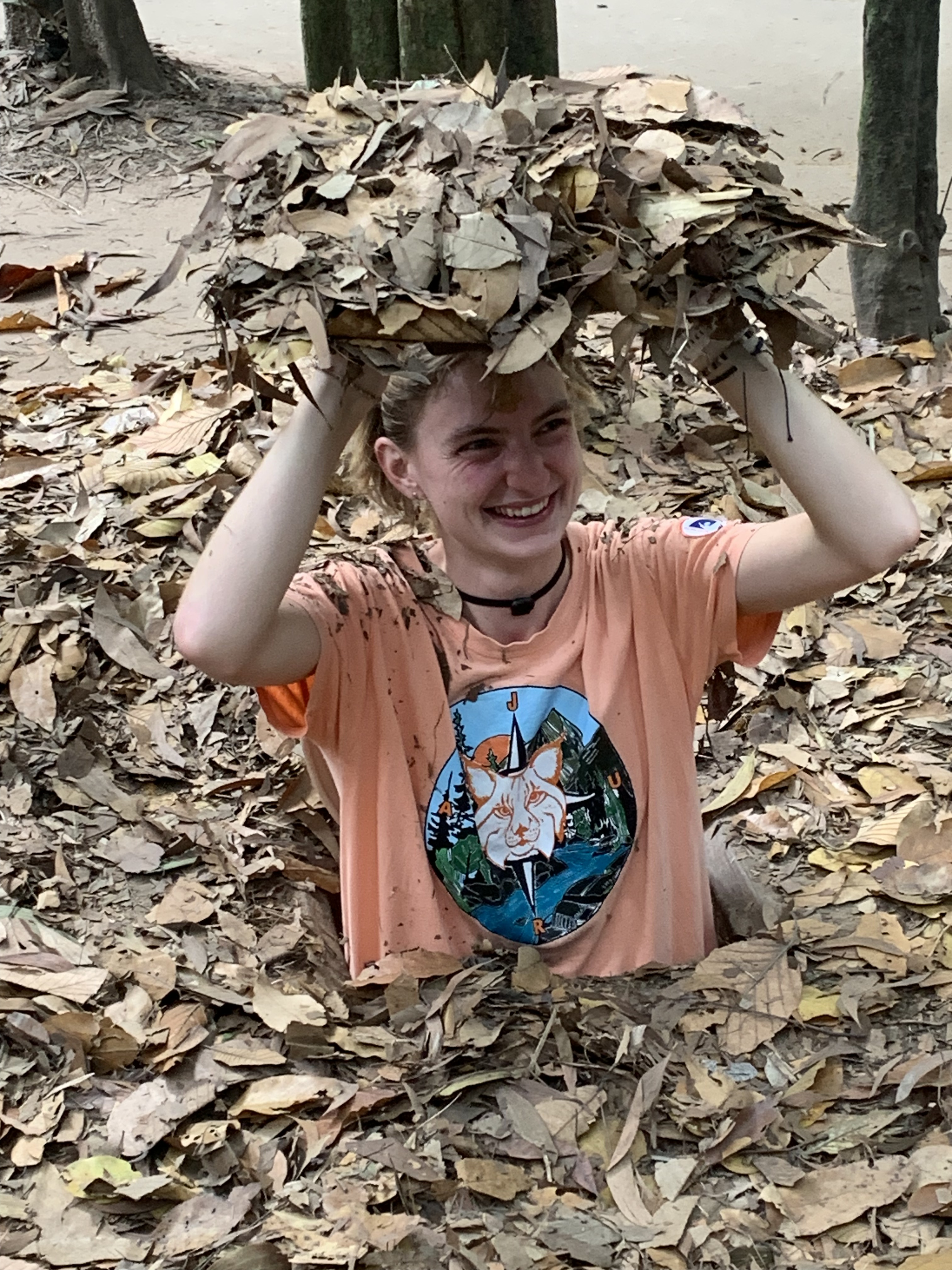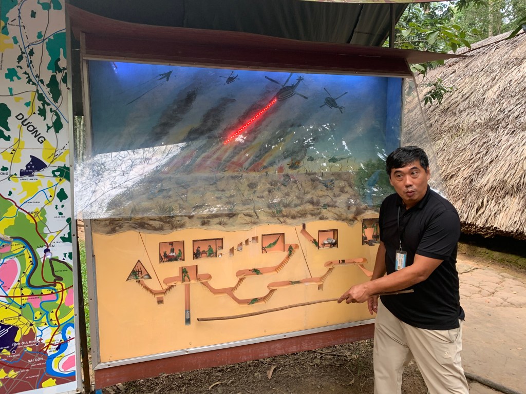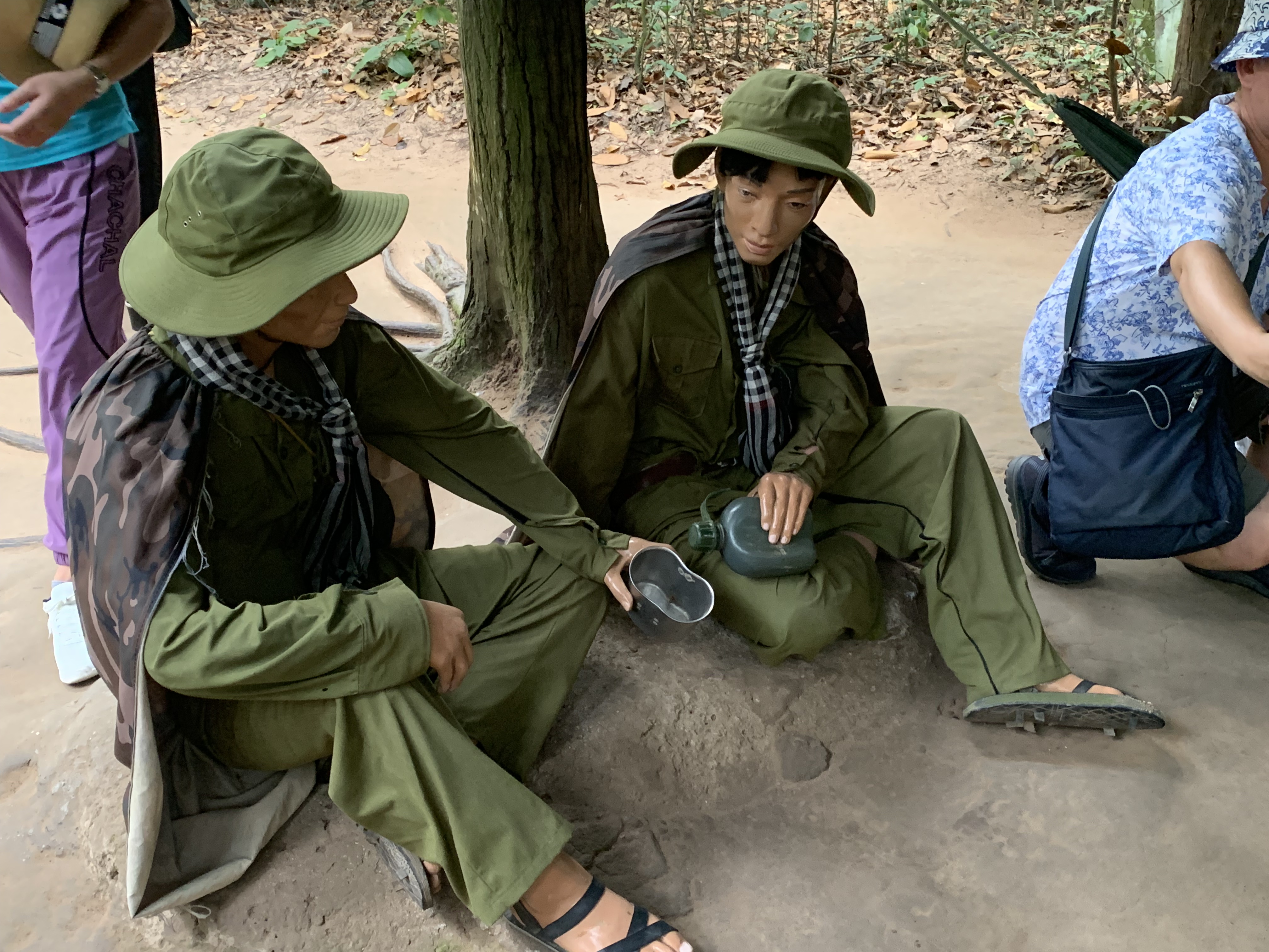 La cathédrale Caodaïste émerge dans un immense parc aux vastes allées. Il est le saint- siège de cette religion fourre-tout qui compte 5 millions de fidèles : un peu de bouddhisme, un zest de confusianisme, une pincée de catholicisme, Victor Hugo élevé au rang de Saint ! Le tout dans un décor ultra kitsch unique. Cette visite au pas de course m’a laissé sur ma faim. Le revers des excursions en groupe. Au sujet de faim, notre guide, à l’anglais tout juste compréhensible, nous a réservé des tables pour le dejeuner dans les environs. C’est l’occasion de sympathiser avec la famille de Hong Kong, de la cuisiner avec des baguettes sur leurs soucis locaux sous la tutelle chinoise. Le minibus nous conduit ensuite dans un des hauts lieux de la résistance vietcong : les tunnels de Cu Chi. Ce site classé lui aussi au hit parade vietnamien de l’hyper tourisme propose aux visiteurs de s’immerger dans l’ambiance souterraine de la guerre américaine, le tout dans décor très « Disney Land, option jungle .