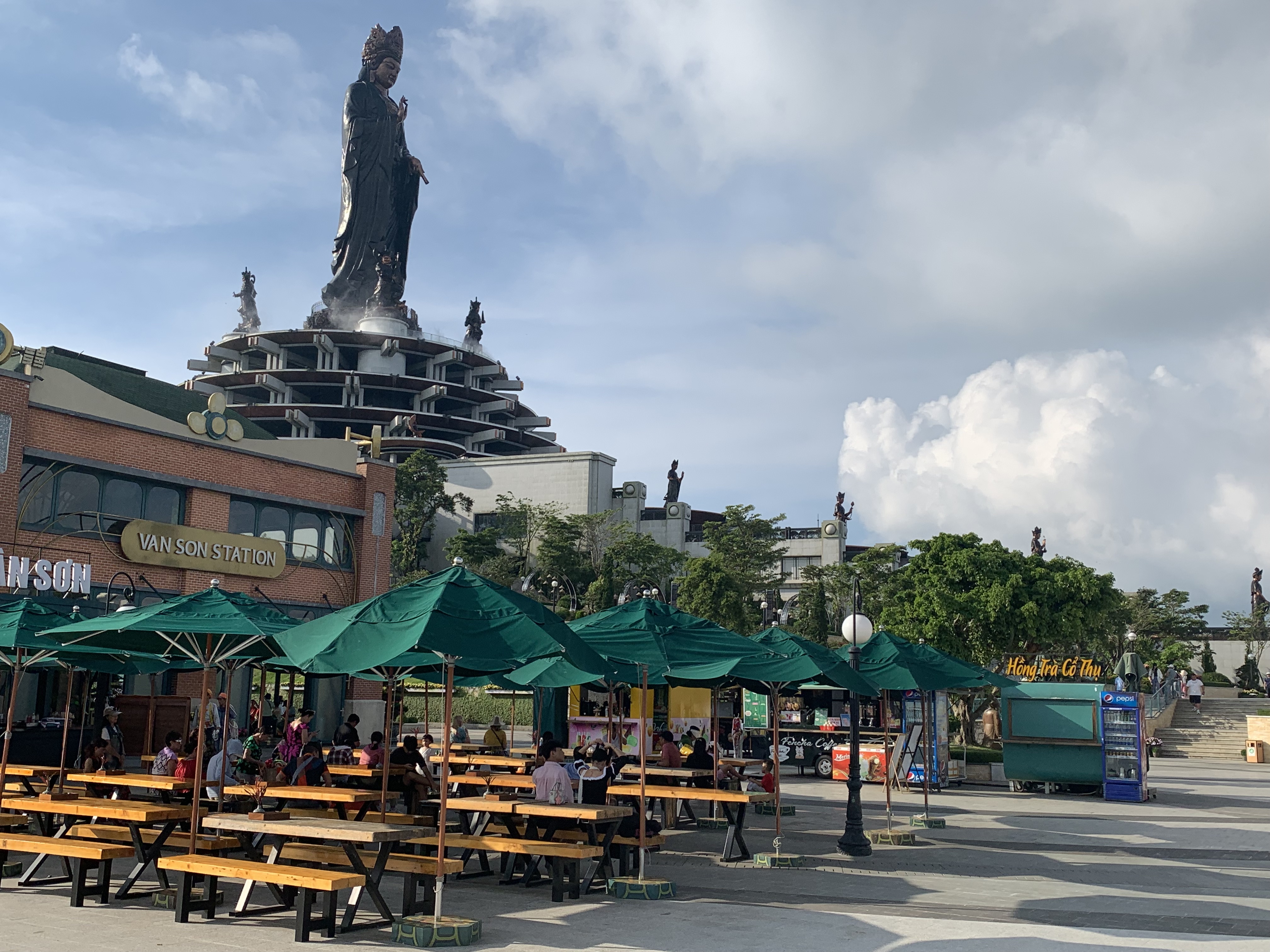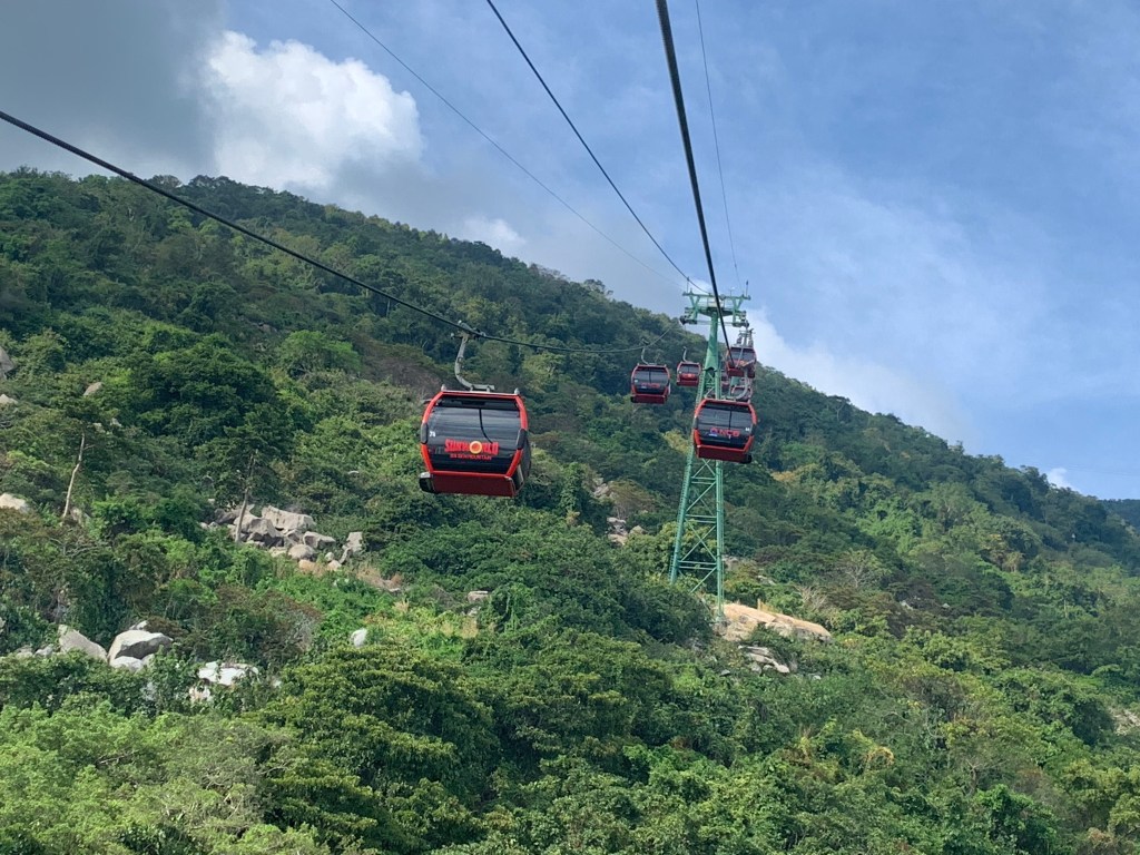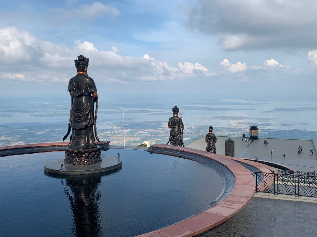 Mannequins articulés, pièges à GI, reconstitution des lieux de vies, des ateliers, la visite se termine par un trajet de dix minutes quelques mètres sous terre. Mon mètre quatre-vingt passe assez mal dans les tunnels et m’oblige à ramper presque dans le noir. Cet expérience inconfortable et flippante ne me laissera un souvenir impérissable. Buvette, boutique à souvenirs , rien ne manque y compris un stand de tir à balles réelles au tarif de 60.000 dongs la balle (entre 2 et 3 euros ! ). Cette journée très chargée dans la région de Tay Ninh se termine par la découverte de Sun World Ba Na , un complexe touristico-religieux phénoménal ultra moderne , d’un très grand raffinement. Il faut prendre un téléphérique qui grimpe à 980 m pour se rendre au pied d’une immense statue et d’un boudhha géant. Des jardins magnifiques tapissent cette colline, le marbre est omniprésent. Ils sont composés de bonzaïs sublimes, d’une armée de bouddhas rieurs et de bassins étagés à débordement. La vue s’étend juqu’à la frontière Cambodgienne relativement proche.