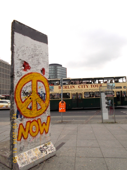 Les panneaux de balisage « Berliner Mauer » apparaissent enfin , ouf ! Nous marchons en pleine campagne dans l’ex-RDA, quelques panneaux montrent les vues aériennes de la région, d’autres décrivent certains sites historiques comme une ancien camp de travail ou de malheureux immigrés de l’Europe de l’Est s’épuisaient aux champs. Souvent j’essayais d’imaginer ce paysage avec ce mur sordide en plein hiver, ces gardes frontières tirant à vue et ces quelques fous qui tentent de fuir par la rivière gelée en pleine nuit. Et cette vision me glaça le sang. Il nous faut ainsi parcourir plus de 15 km pour toucher les quartiers habités de Berlin. Cette ville étonnante fut en fait constituée d’une agglomération d’anciens petits bourgs, une capitale vaste désormais comme 5 fois Paris ! Autre constatation, ce mur fut tracé à la hâte entre les habitations et les rues sans vraiment de logique . Autrement dit, le randonneur est soumis à de nombreuses bifurcations et doit veiller à ne pas perdre de vue le balisage . Inutile d’ajouter que nous l’avons paumé et rechercher à plusieurs reprises, sur la carte , avec le GPS de l’Iphone, en interpelant des commerçants du coin. Force est de constater que la nouvelle génération de Berlinois ou les nouveaux immigrés turcs n’ont qu’une vague idée de l’emplacement du mur. Non loin de Pankow, nous arrivons par le Mauer Park, site fréquenté par les Berlinois lors du marché au puces hebdomadaire. Enfin, le mur se dresse à Gedenkstätte. Après la chute du mur, l’ouvrage a été revendu par morceaux à prix d’or, des tonnes de ciment aussi servi à la construction de routes . Comme si Berlin avait voulu effacer cette Nous sommes maintenant au coeur de Berlin, c’est à dire dans un sympathique enfer touristique où le mur occupe une place de choix. La trace nous plante devant le Reichtag dont le dôme de verre resplendit sous un pâle soleil. La police nous invite gentiment à contourner l’obstacle imposant pour des raisons de sécurité. De l’autre côté de l’édifice, nous prenons la direction de la porte de Brandebug qui est à Berlin ce qu’est l’Arc de Triomphe à Paris. Les Champs Elysées s’appellent ici Unter Den Linden, une avenue tout aussi bondée. Rappelons que cet édifice emblématique se retrouvait à l’Est lors de la construction du mur. En longeant le Tiegarden, le parc central de la ville, nous sommes de nouveau face au passé tragique de l’Allemagne. Non loin du mémorial de l’Holocauste, un autre mémorial rend hommage aux déportés homosexuels des camps nazis. La double rangée de pavés disparaitra souvent sous nos yeux , engloutie ici par un restaurant , un pont , un espace vert . Les Berlinois y a garent dessus leur voiture désormais sans même y songer alors que les touristes immortalisent leur visite par d’innombrables photos ou selfies. Arrivés à la Pozdamer Platz, le mur occupe un nouvel espace avec quelques blocs et une description historique succincte de sa contruction. Clic-clac et direction plein Est depuis le quartier de Mitte pour rejoindre un musée récent construit aux abords de vestige du mur : la Topographie de la Terreur. Nous nous trouvons ici dans le secteur qui fut le quartier général de la Gestapo. Des fouilles ont permis de dégager à ciel ouvert les géoles de la police nazi. Un long parcours rectiligne y retrace en images et textes l’anéantissement de la ville de Varsovie par Hitler. Ce site exceptionnel, dont l’entrée est gratuit fait cheminer le visiteur dans une chronologie terrifiante subliment illustrée et commentée de la montée du nazisme ainsi que du rôle qui jouait la Gestapo. On en sort un peu sonné avant de faire un détour plus léger par l’incontournable Check Point Charlie. Sur ce carrefour mythique sur la Friedrichstrasse, ancien point de contrôle C entre Berlin Ouest et Berlin Est contrôlé par les Américains, les boutiques de souvenirs s’agglutinent, jouxtant les musées dédiés au mur et à ses évasions spectaculaires , les bars couleur RDA , les restaurants option déco Traban ou uniformes russes , toute une industrie touristique érigée au souvenir, à l’exploitation du mur, bref du business 100% béton. Certains Berlinois affichent d’ailleurs un certain ras-le-bol de ces vagues touristiques perpétuelles pourtant si lucratives pour l’économie locale. Ce tracé du Mur de Berlin nous conduit au Mémorial du Mur sur la BernauerStrass , plus de 30 personnes y sont mortes.