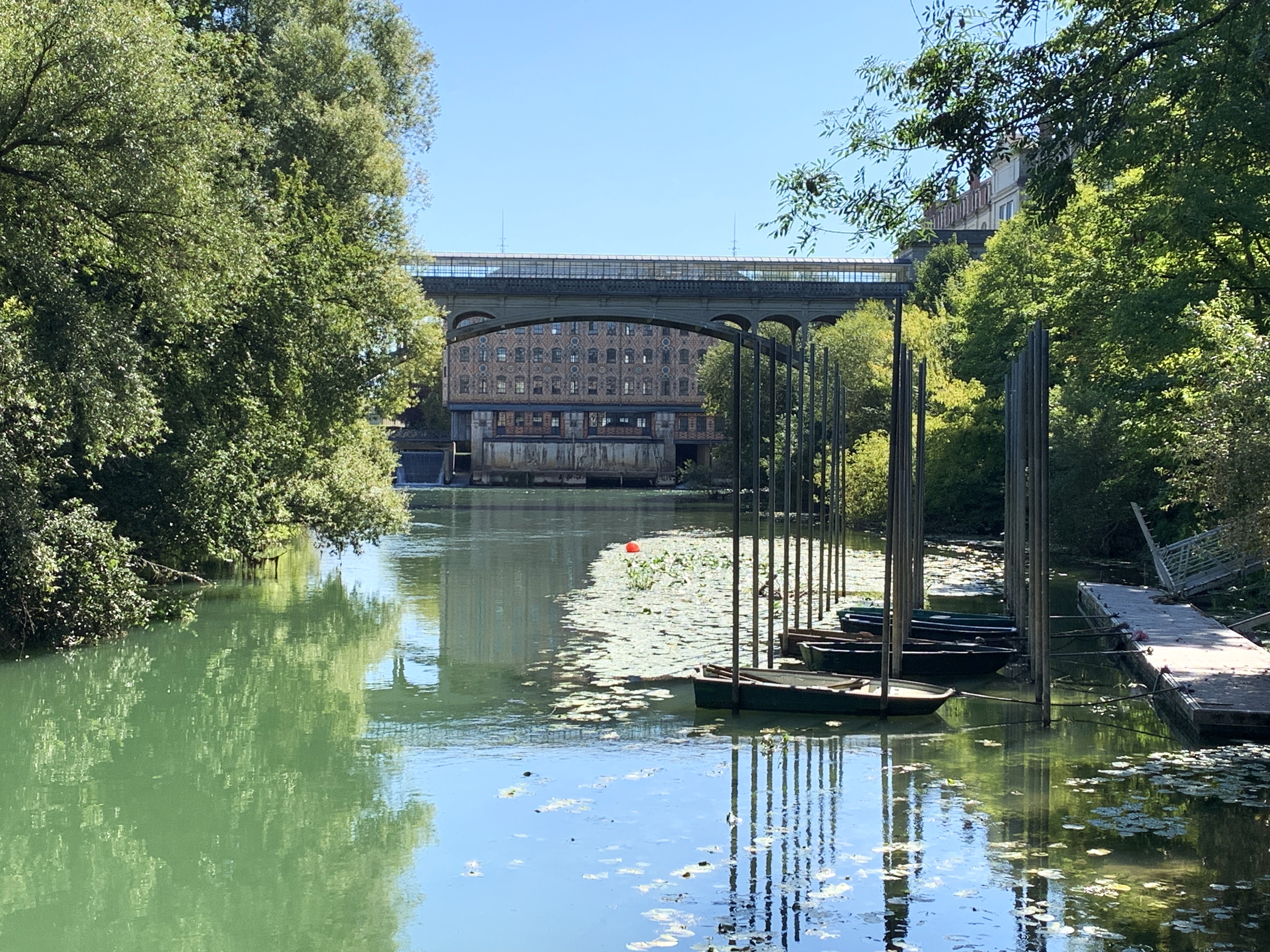 Vous atteindrez rapidement l’ancienne cité industrielle de « la pièce aux chats » composée principalement des bâtiments de l’ancienne chocolaterie Meunier. Ce trésor du patrimoine se visite. Des barques sont aussi proposées en aval pour faire le tour du propriétaire. Toujours sur la même rive vous laisserez sur votre gauche le vaste Parc de Noisiel faisant face au Parc de Loisirs de Vaires situé sur la rive droite.