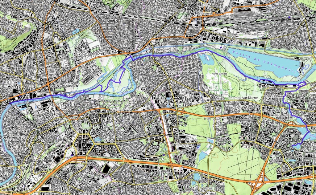 Vous rejoignez Lognes par le RER A au départ de la gare de Lyon par exemple . Les premiers kilomètres traversent une succession de lacs artificiels destinés à contenir les crues du Maubée, un affluent de la Marne. Ces réalisations se sont accompagnées par la création de parcs verdoyants où il fait bon flâner avant de rejoindre la rivière.