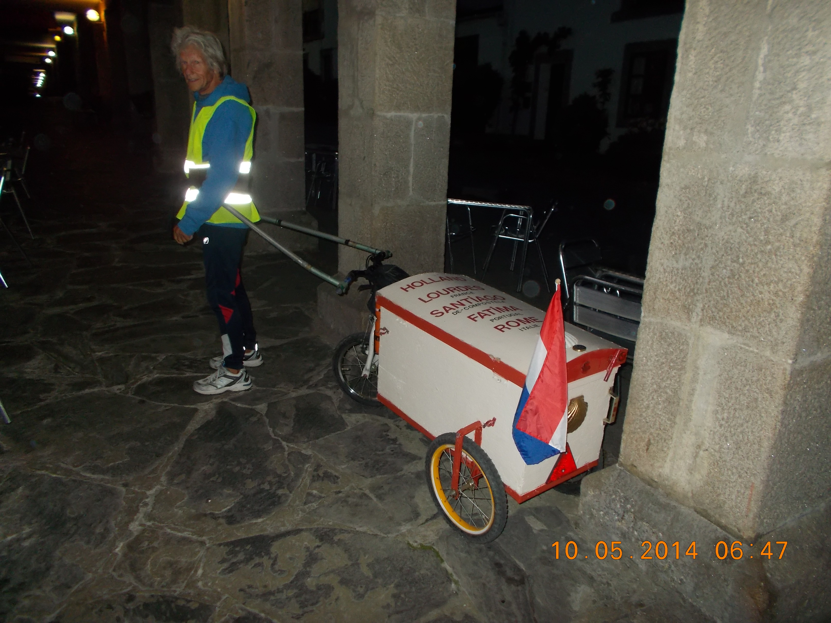 Au début, j’ai cru à une hallucination lorsque j’ai vu arriver ce bonhomme maigrichon en ville, dans une albergue à Palace del Rei sur le Camino de Francès l’an dernier. Il tirait une remorque blanche derrière lui, avec un drapeau hollandais flottant dans l’air tiède . Je me suis approché pour voir à quoi ressemblait cet étrange équipage. Il m’a fallut juste lire les inscriptions sur le capot pour commencer à comprendre à quel genre de personnage j’avais à faire. L’air éreinté mais souriant, le type, véritable bête de somme sorti de nulle part, s’est débarrassé lentement du harnais puis il prit un des deux bidons accrochés sur la remorque pour se ré-hydrater. Il était grand, très mince, des cheveux gris tombaient de chaque côté de son beau visage . Puis il a maœuvré pour garer sa carriole dans le garage à vélo. Il ne cessait de sourire, visiblement comptant d’être arrivé. Jan vient de Hollande mais Compostelle ne signe pas la fin de son voyage, son pèlerinage. Avant d’arriver sur le Camino, il est d’abord passé par Lourdes . Après Santiago, il se rendra à Fatima puis repartira encore plus loin : à Rome ! J’allais diner avec d’autres pèlerins et je le recroisais au centre ville .