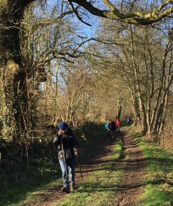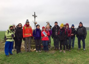 variable avec une mystérieuse Anne-Marie. Bravo ! Le vent polaire tourbillonnant en fait sous le lavoir , je pris même mon dessert avec les gants, le déjeuner ne dura pas plus de 35 minutes, il fallut décampé avant la congélation. On n’y croyait pas mais un rayon de soleil miraculeux perça soudain les nuages en éclairant le paysage d’une lumière quasi divine. Un petit bonheur furtif mais sublime. Puis une moitié du groupe s’enfonça dans les bois pour aller découvrir la