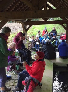 Afin de positiver, Chantal évoqua la chance de pouvoir tester l’étanchéité du matériel et nous gratifia dans le RER D d’une touche culturelle relative au passé de Fosses : une ville de potiers, des artisans qui creusaient … des fosses pour en extraire l’argile. De ce côté là, tout le monde allaient être gâté. Le matériau gluant à souhait nous colla gravement les baskettes durant des lieues. Par chance, le ciel ne nous tomba pas sur la tête malgré la menace de quelques giboulées neigeuses . Après une douzaine de kilomètres, on arriva comme prévu (glaiseux mais heureux) au lavoir qui nous servirait d’abri pour le pique-nique. La fatigue et le froid tiraient sur les organismes, la reine Anita 1 ère victime d’un coup d’hypotension fut remise sur pied à coup de dattes et boissons chaudes. Béatrice arrosa le groupe au rhum arrangé, Vincent, militant engagé et rebelle réussit à nous épargner durant douze secondes son flux verbal politico-social passionné, sur Aubenas-centre-du-monde , le tout sur fond de concubinage à géométrie