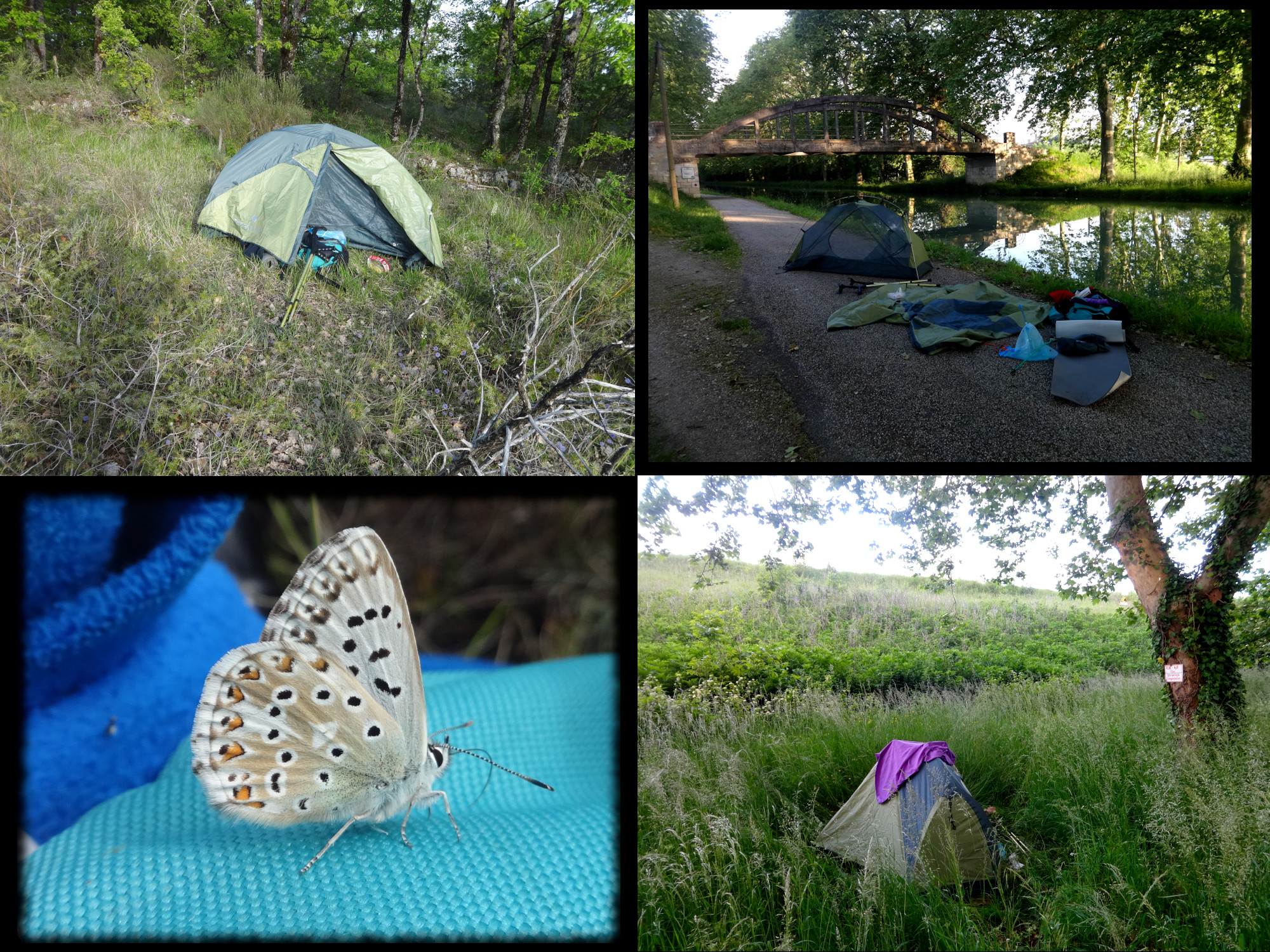 – Après Pampelune (Pamplona), j’ai dormi sur une pelouse près d’une église. Pas de bol : grosse lumière dans la patate, puis cloches tous les quarts d’heure et pour arroser le tout : pluie dans la nuit. J’ai dû repartir avant l’aube. – En Gascogne ; J’ai monté une fois ma tente sous un orage ! Il est arrivé plus vite que prévu. Pas marrant pour ensuite entrer tout trempé dans la tente. Quant au lendemain, j’ai dû transporter la tente toute humide sous une météo maussade. – Dans le Languedoc, j’ai une fois installé ma tente sous des éoliennes. Mauvaise idée : ça fait un de ces bruits ! – J’ai dormi une fois sur une plage (Hendaye) : tranquille jusque vers minuit où une bande de jeunes est arrivé. L’un d’entre eux a fait pipi à une vingtaine de mètres de moi… Mais on ne m’a pas vu. – Dans un village, en Castille, nous étions deux. On nous a indiqué un joli parc. Malheureusement, un chien a aboyé toute la nuit… – Sous le Pont du Diable, avant Saint-Guilhem-le-Désert, il était interdit de camper. Site extraordinaire, mais perturbé par l’idée que la Maréchaussée débarque en pleine nuit pour me virer. BREF MIEUX VAUT DORMIR LOIN DES HABITATIONS : des bois, des coins sauvages, dans le silence et la solitude. C.Q.F.D.