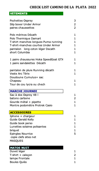 Les chaussures de trail Hoka Speed Goat 5 (semelle Vibram) ont tenu la distance malgré une usure très marquée après le Pays Basque et la Cantabrie. L’étanchéité Gore Tex n’a pas tenu très longtemps. J’ai manqué d’une polaire légère intermédiaire en alternance avec la doudoune Cimalp. J’ai marché à 98 % en short, avec un pantalon de pluie trail Evadict (Décathlon) les matin frisquets.