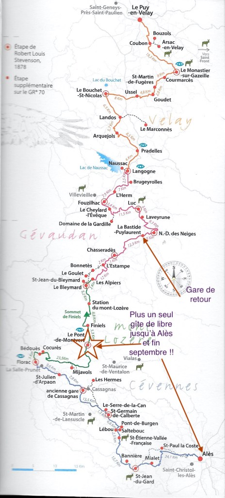 Faute d’avoir sous évaluer l’effet Covid sur l’hébergement, sous évaluer le nombre de randonneurs encore sur Stevenson en septembre , faute d’avoir emporter ne serait-ce qu’une tente et un tapis de sol, je renonçais ainsi à finir ce chemin à la Bastide PuyLaurent. Quel âne aurait dit Robert Louis !