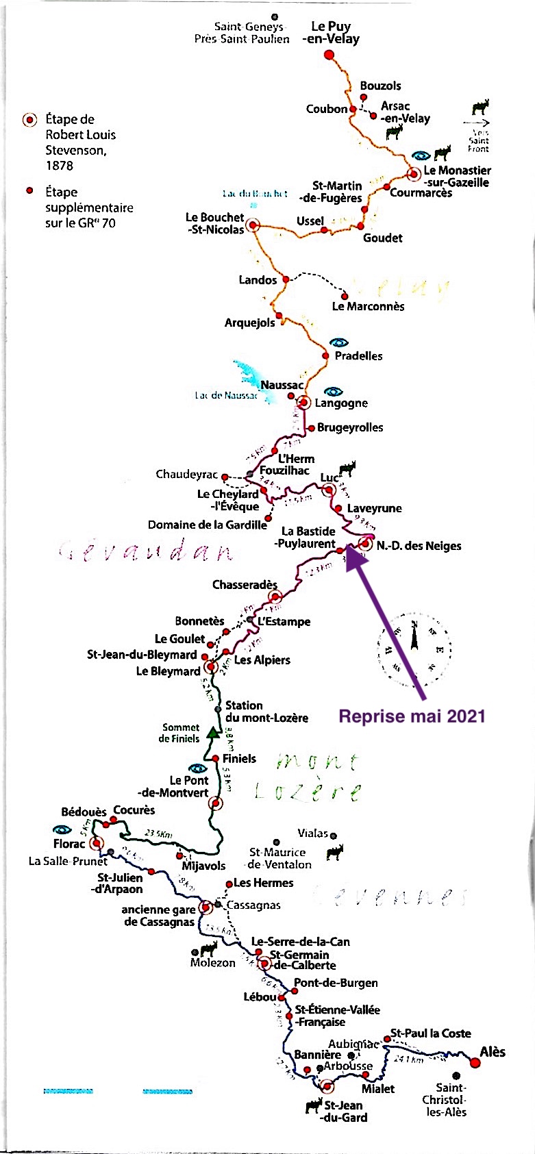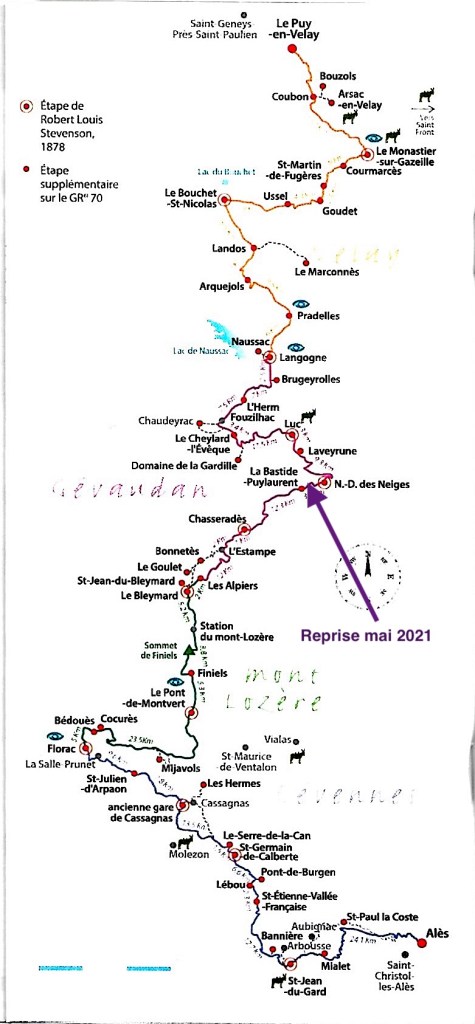 Rappelez-vous, je vous avais laisser en septembre dernier le moral dans les chaussettes après avoir dû quitter le Chemin de Stevenson à La Bastide PuyLaurent en septembre 2020 . (voir l’article) . C’était bien la première fois que j’abandonnais un parcours de randonnée faute de trouver un lit et ce à cause du COVID qui provoqua une forte diminution de la capacité d’hébergement. La leçon fut apprise et je réservais la totalité des étapes dès le mois de janvier.