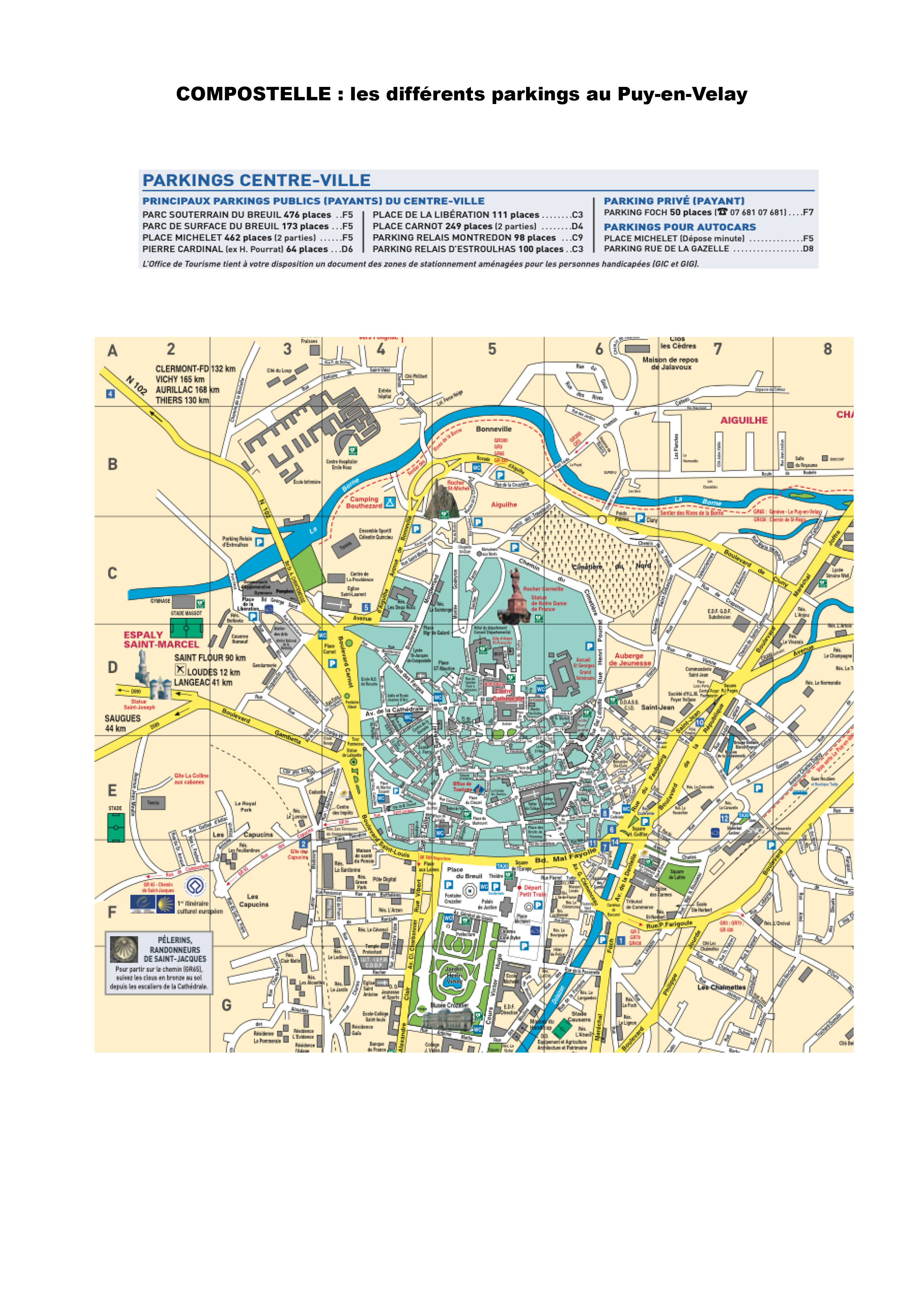 • CR – Parking Foch – 6, avenue Maréchal Foch Tél. 07 68 10 76 81 – http://www.parkinglepuyenvelay.fr – parkinglepuyenvelay@gmail.com Ouvert 7j/7 et 24h/24 WE et jours fériés compris – Parking situé en centre-ville, forfait spécial randonneurs (sur réservation – Pas de limitation de hauteur, pour véhicule VL exclusivement – surveillance vidéo – 7 jours 22 € – 14 jours 44 €