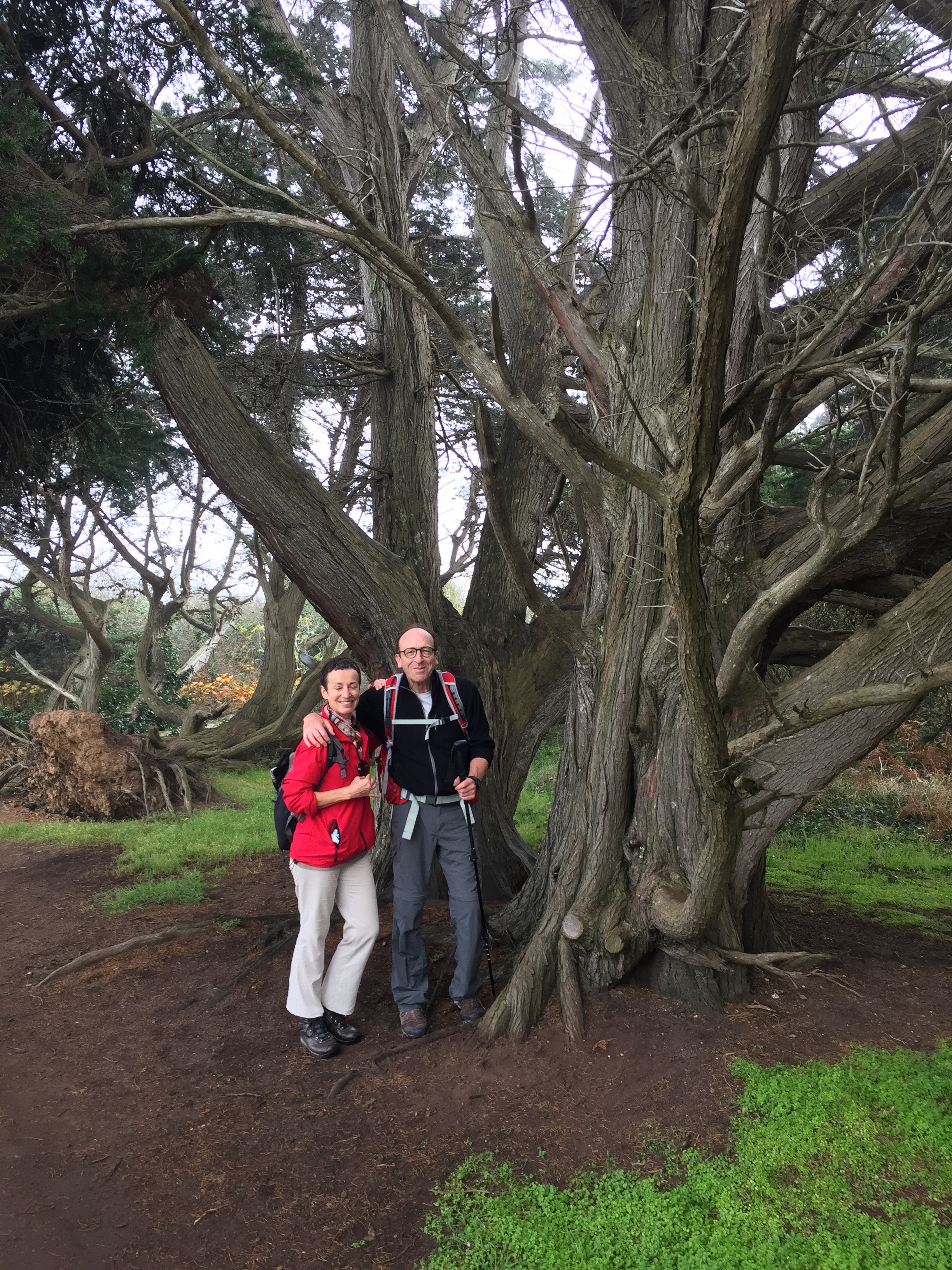 la région explose son record historique d’ensoleillement à cette date. Après trois jours d’exploration à vélo et quelques héroïques allers-retours pédestres à Sarzeau pour le ravitaillement, on profite de la fenêtre météo « supportable » pour organiser notre rando sur le GR34 avant la journée du lendemain annoncée à -10°c au lever du jour ! Nous sommes loin de la douceur du séjour de novembre dernier, de notre périple par la face nord de la presqu’île de Rhuys par le sentier longeant les marais et parcs à huîtres du Golfe et plus encore de notre dinette improvisée sur la plage. Action ! Le car de la ligne 24 en provenance de Vannes stoppe à Sarzeau station et nous dépose au port du Crouesty vers 13h00. La brise glaciale joue dans les drisses des bateaux et sur les pontons où personne de lucide n’ose déambuler par ce climat. Le GR34 passe ici devant les terrasses des cafés clos, on le suit jusqu’au Petit Mont et son tumulus. Le vestige de pierres préhistorique nous abrite à peine et le pique-nique est expédié. La végétation tente une timide sortie de l’hiver, pourvu que les premiers bourgeons résistent aux attaques tardives de ce froid inhabituel dans le Morbihan. La nature porte encore les traces des tempêtes récentes. Des pins jonchent ici et là encore le sol, des troncs fraichement
