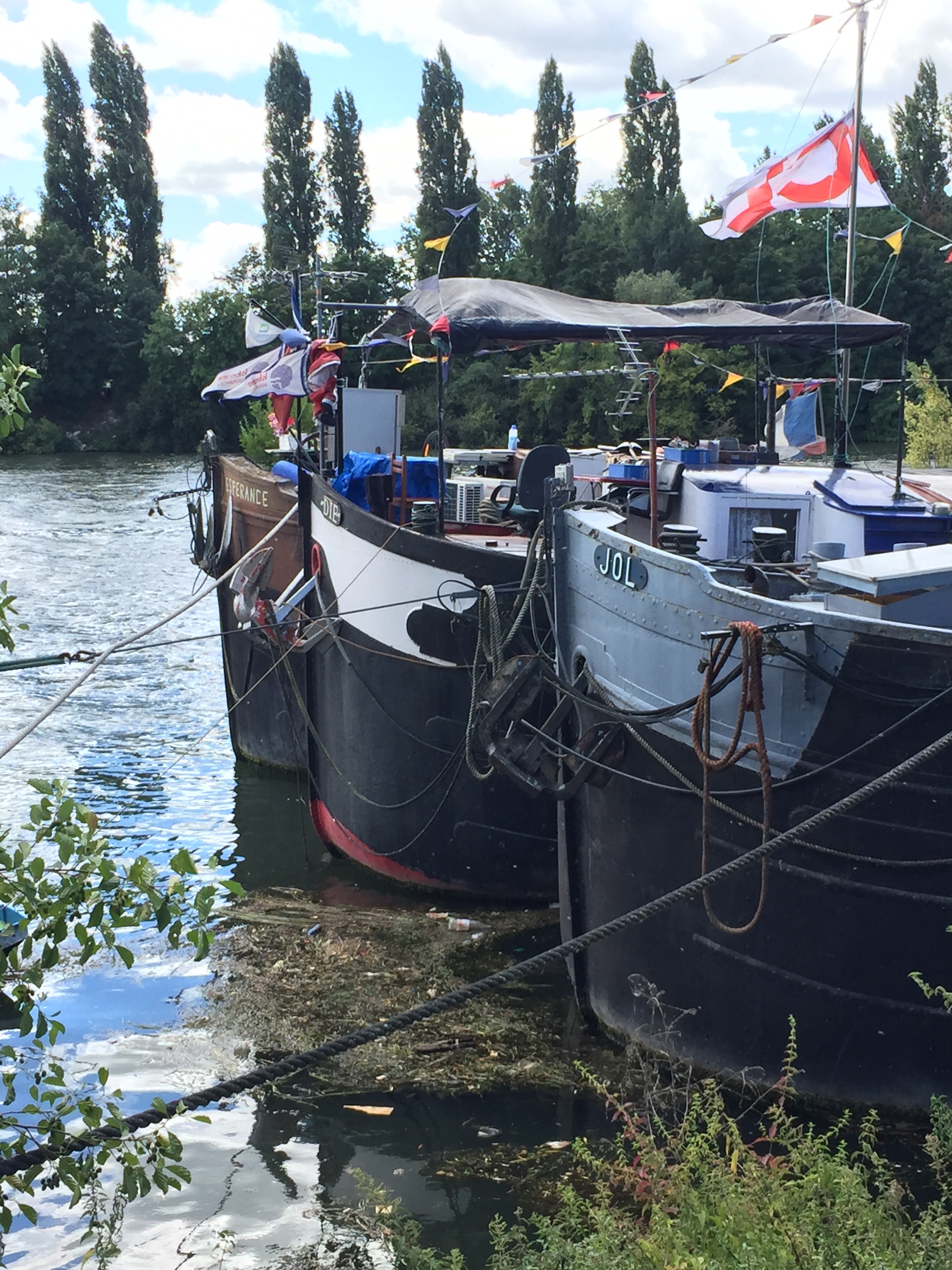 Il y a des dimanches où une étrange flemme vous cloue au lit et vous fait renoncer à prendre le train et rejoindre votre club de rando. Ce jour-là le soleil a eu cependant le dernier mot et a poussé le randonneur à boucler son sac à la hâte et claquer la porte pour une journée de balade en solo. Depuis le temps que les péniches de Conflans St Honorine me faisaient de l’œil lorsque je passais en RER sur les hauteurs de la ville, il fallait que j’ aille voir ce fleuron de la batellerie de plus près. Je rejoignais la gare de Maisons-Laffitte et commençais mon périple en suivant le GR2 qui longe la Seine. La traversée de Sartrouville, Cormeille-en-Parisi n ‘a rien de folichon entre cimenteries désaffectées et décharges sauvages. Puis soudain le GR2 prend de l’altitude (quelques dizaines de mètres ! ), un sentier étroit et verdoyant me guide vers La Frette. Un circuit thématique entraîne ici le randonneur sur la trace des peintres Impressionnistes dont Pissaro. Il fait dire que le paysage se prête à la rêverie, à un voyage au XIXe siècle , époque des bateaux-lavoirs, des barges en partance pour Rouen ou le Havre . Le fleuve serpente lentement dans son écrin. Au loin les usines du Val d’Oise replongent le visiteur dans le présent. Il faut presque trois heures pour atteindre le Port Saint-Nicolas de Conflans- St Honorine. Avec les années, la petite ville a pris une dimension touristique que j’ignorais. Les quais boueux de jadis ont été réaménagés en promenade où l’on se pause ou se délasse sur des transat de bois. Les péniches d’habitation fleuries bord à bord donnent une merveilleuse impression de quiétude voire de vacance. Les chantiers de naguère ont presque tous disparus, les berges ont ouvert leurs espaces aux restaurants dont les terrasses ombragées font désormais le bonheur des familles en balade ou des amoureux en quête de romantisme. Les affamés d’histoire ne manqueront pas d’aller visiter le Musée de la Batellerie. Je franchis la Seine par la passerelle en contre-bas de l’autoroute de Cergy-Pontoise afin de reprendre mon chemin par la forêt de St Germain Laye lovée dans cette boucle du fleuve. Plat et monotone avec ses allées rectilignes interminables , bois n’est pas vraiment ma tasse de thé. Son seul mérite reste à mes yeux sa proximité de la Capitale. Gps en main je repique vers l’Est pour rejoindre la gare de Maisons-Laffitte en zigzagant de chemin en chemin . Seul un itiniraire pédagogique attirera mon attention. Une signalétique bien faite apprend aux promeneurs curieux à reconnaître les différentes essences qui peuplent la forêt . Le GR2 traverse l’ Ile de France sur 260 km, , la variété de ses sites justifie que l’on y reviennent s’y attarde .