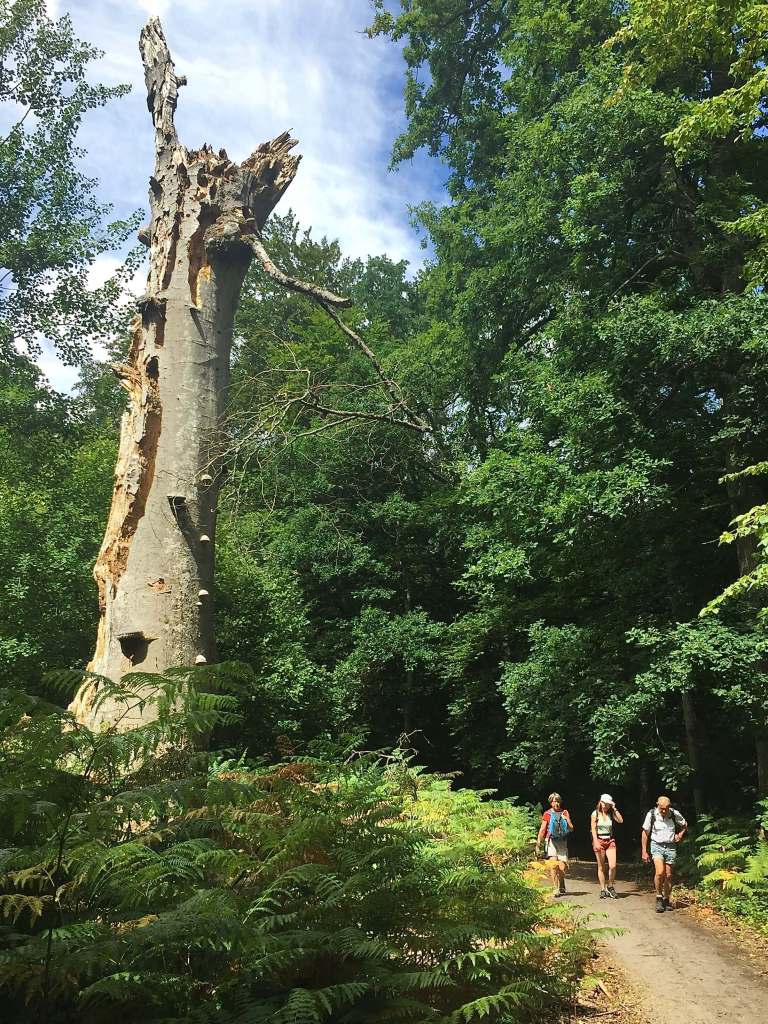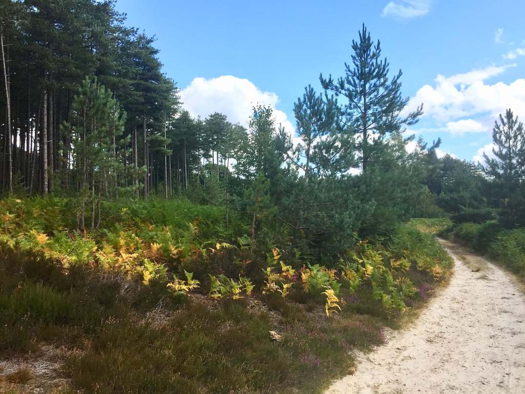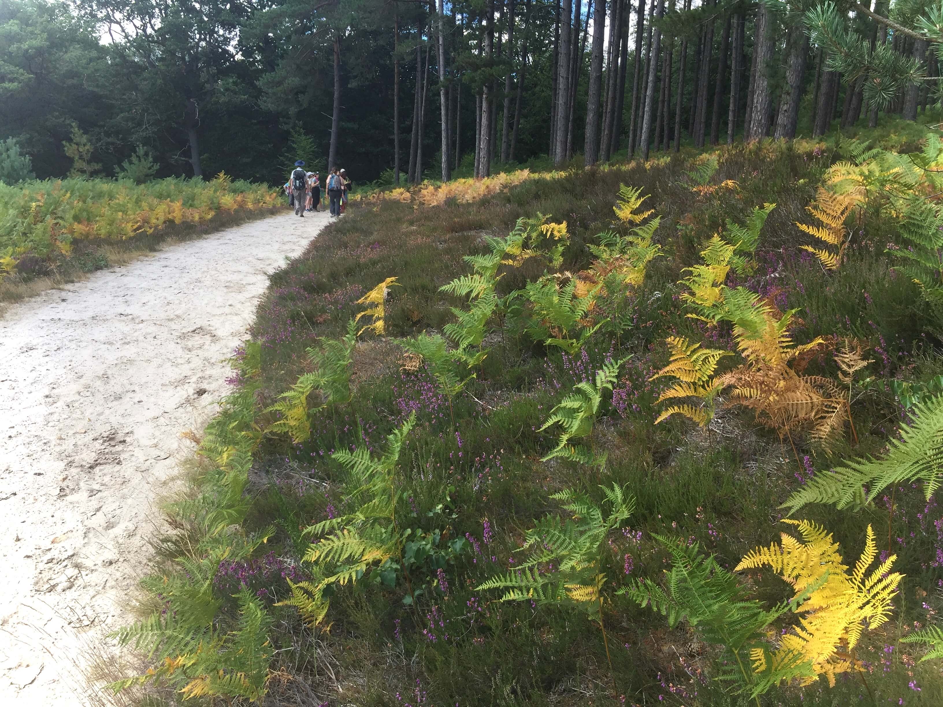 En ce mois de juillet et par une journée très lumineuse, la nature nous gratifie d’un festival de couleurs. Les chênes se mêlent aux bouleaux et aux châtaigniers alors que les fougères d’un vert éclatant dominent les bruyères et autres fleurs de printemps. Sublime ! Les sentiers sablonneux typiques des forêts de pins rendent la rando confortable. Le chemin se devine parfois entre ces fougères qui frôlent par endroit les épaules ou se perd dans de longues allées. Rien d’étonnant à ce que l’on partage cet espace avec les cavaliers et les VTT , chacun y trouve son compte d’évasion. Vous y rencontrerez d’ailleurs de nombreux haras et clubs équestres dans les environs. Cette randonnée vous fera passer par le fameux GR22 , un magnifique sentier qui mène au Mont St Michel . Courage !