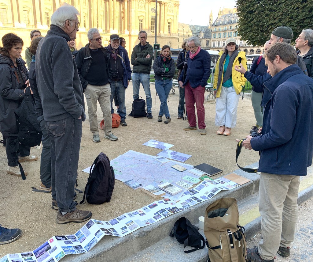 Briefing à 9h sur le parvis de l’église St Germain -l’Auxerrois. Montage de l’Axe avec des cartes IGN au 1:25.000e