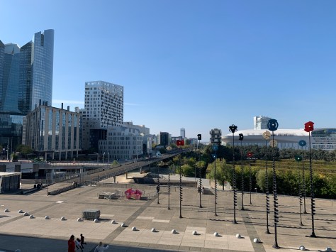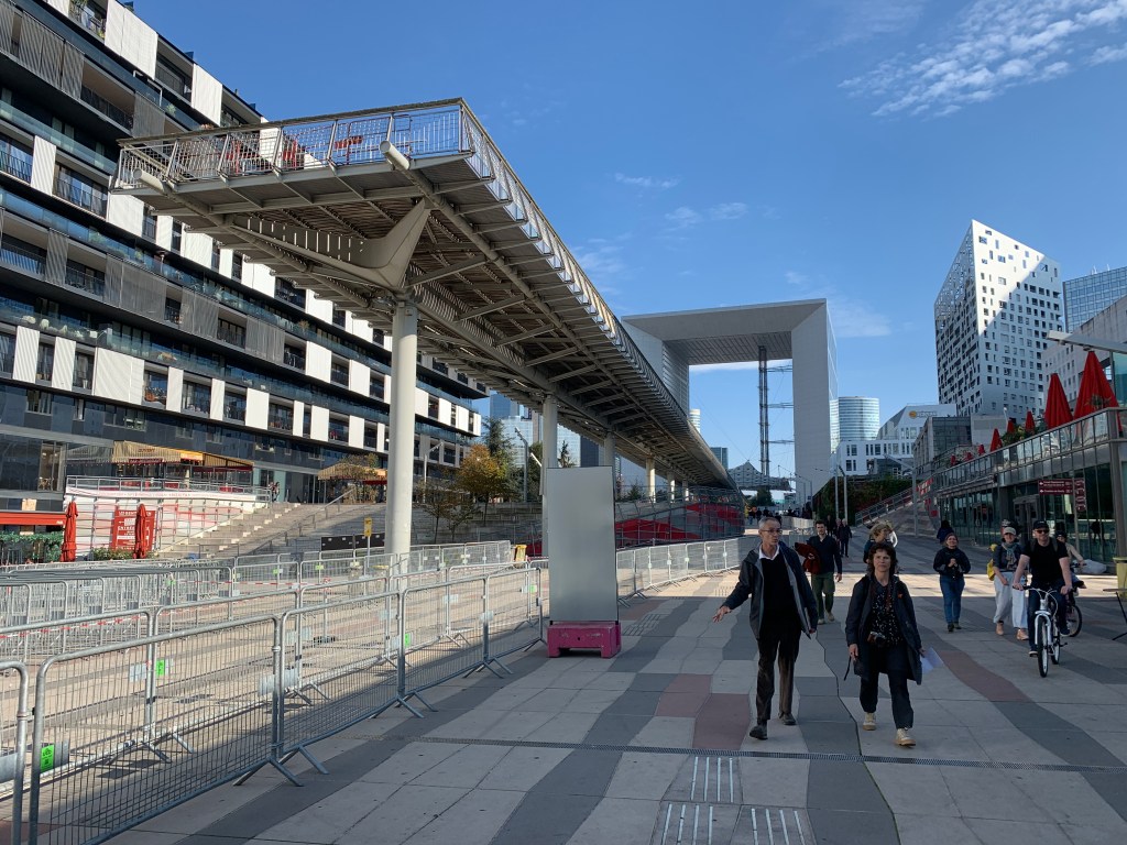 Après un pique-nique dans un parc de l’île de Puteaux, les marcheurs vont traverser le centre d’affaires de la Défense, une dalle maintenue à une vingtaine de mètres au-dessus du sol par un labyrinthe de béton, un univers inachevé , le phantasme de promoteurs, ou encore le squat de sans-abri. Après quelques bidouillages de verdure, l’esplanade profite aujourd’hui d’une vraie végétalisation. Il est impossible de manquer la Grande Arche, qui domine l’ensemble du site. Il suffit de grimper la volée de marches pour admirer cet axe historique vers l’Est, magnifique enfilade où se devine le Louvre.
