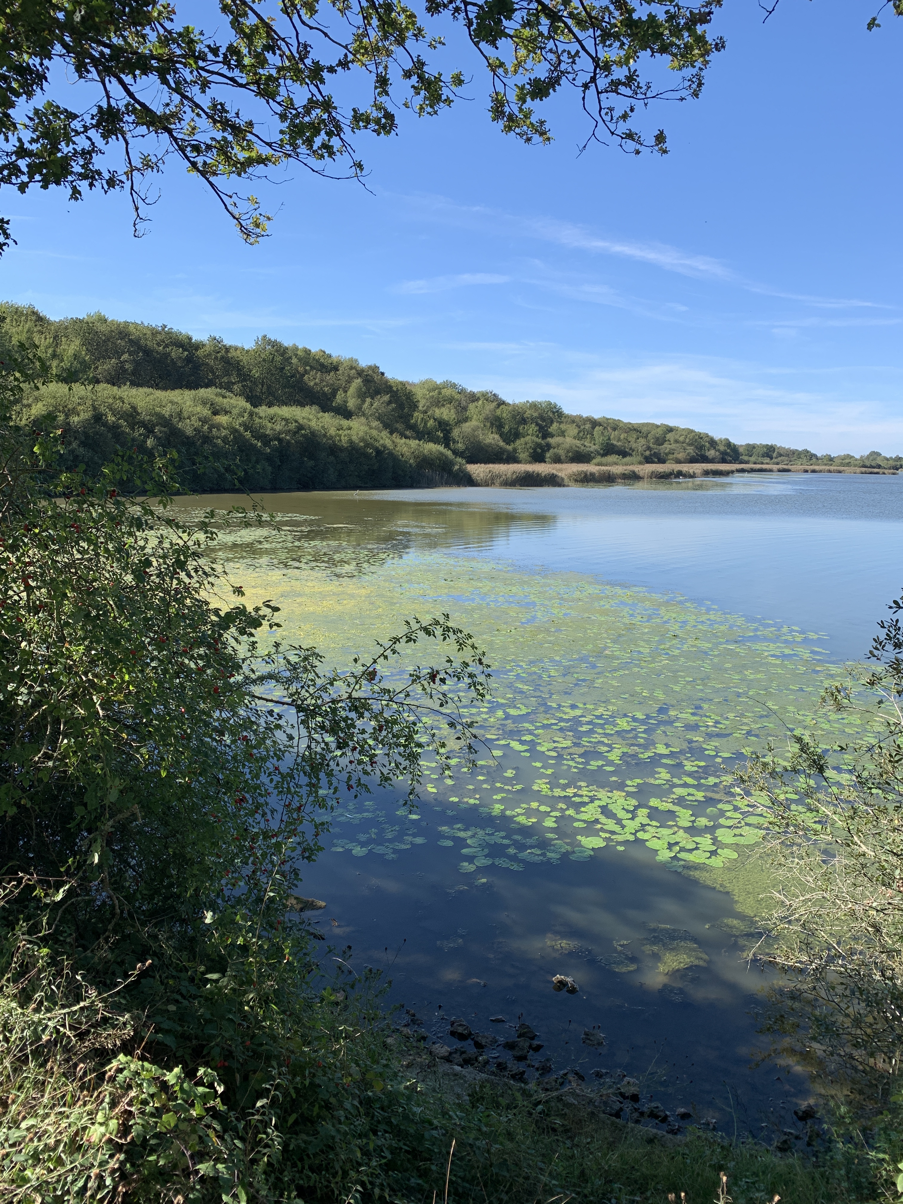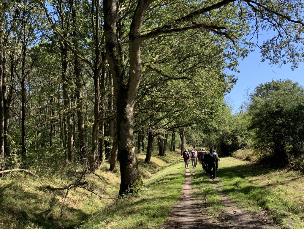 Le groupe les quitte un moment et amorcent une descente à pic vers les étangs de Hollande afin d’y pique-niquer. L’étroit sentier plonge dans la verdure. En bas, les plans d’eau séparés par des digues s’étalent d’ouest en est. Le centre nautique est déjà fermé, les randonneurs s’installent dans le sous-bois voisin. La brise et le soleil jouent entre la cime des arbres laissant passer les rayons lumineux et les dernières bouffées de chaleur de l’été qui s’estompe. On resterait bien là plus longtemps à rêvasser sous l’envers des feuillages, à sentir cette douce morsure de l’astre mais il faut déjà repartir vers le Perray, notre gare de retour au terme d’une journée revigorante tant pour le corps que pour le moral.
