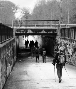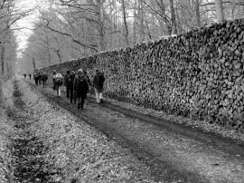 Nous sommes ce matin-là de février en Seine et Marne . Le RER A pris à Nation dépose le groupe dans la gare déserte de Bussy-Saint-Georges. Pour vous, visiteurs de province, qui ne connaissez pas bien la banlieue Est de Paris, sachez que Bussy est disons un dommage collatéral de la création du parc Disneyland de Marne-La-Vallée . La ville totalement neuve semble sortie de nulle part, de ce qui fut jadis la campagne. Il a donc fallut traverser une litanie de petits immeubles tous identiques pour rejoindre la forêt de Ferrière-en Brie, non s’en enjamber l’autoroute A4 , un échangeur et enchaîner quelques rond-points d’une zone commerciale classique, en taule ondulée. A cet instant précis de la randonnée, on peut envisager deux solutions. Soit reprendre le RER illico et se faire l’intégrale des trois saisons de Picky Blinders sur Netflix en survêt