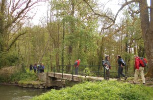 Vu la distance non négociable, le rythme imposé et malgré une météo plus que clémente, seulement quatorze randonneurs répondirent présent au rendez-vous de la Gare du Nord. Treize filles, le guide et votre serviteur. Dès le départ de la gare de l’Isle Adam-Parmain, mes craintes se confirmaient, d’autant que le groupe de tueuses mené par Stéphane partit à fond le long de l’Oise. Comment allais-je pouvoir tenir la cadence infernale sur 32 km derrière cette meute gonflée à bloc ? Stéphanie dans mes pas, une baroudeuse de l’asso qui connaissait la musique pour avoir fait les 40 km du Mont Saint-Michel avec lui, je laissais filer et pris le temps du warm up habituel. (Il me faut bien 6 à 8 km pour atteindre ma vitesse de croisière.) Nous n’étions pas les seuls à trainasser en queue de peloton. Dès le briefing j’avais remarqué  Émilie, une nouvelle venue plutôt fluette et chaussée de simples tennis. J’essayais d’écarter mes a priori relatifs à l’équipement douteux de certains randonneurs, mais par expérience je savais qu’elle allait connaître de vrais soucis sur une telle distance. Il fallut pas moins de 16 km et la pause déjeuner au bord d’un étang baigné de soleil pour que le groupe mette enfin un bémol à cette marche rapide. Heureusement ce beau parcours en forêt ne présentait pas  de grosses difficultés si ce n’est quelques bosses, histoire de nous rappeler que ce tour de l’Ile-de-France